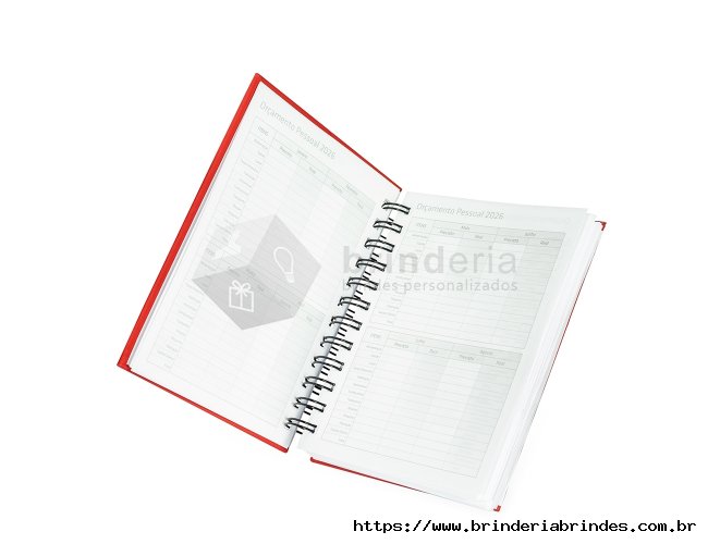 Agenda 2026 com capa emborrachada e encadernação em Wire-O metálico. Conta com páginas dedicadas para dados pessoais, calendários de 2025 a 2027, orçamento pessoal, planejamento mensal, espaço para anotações diárias e lista de contatos e aniversários.