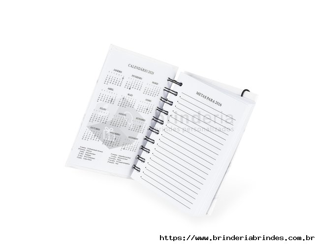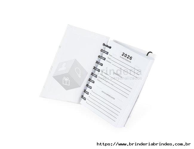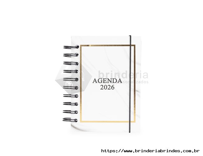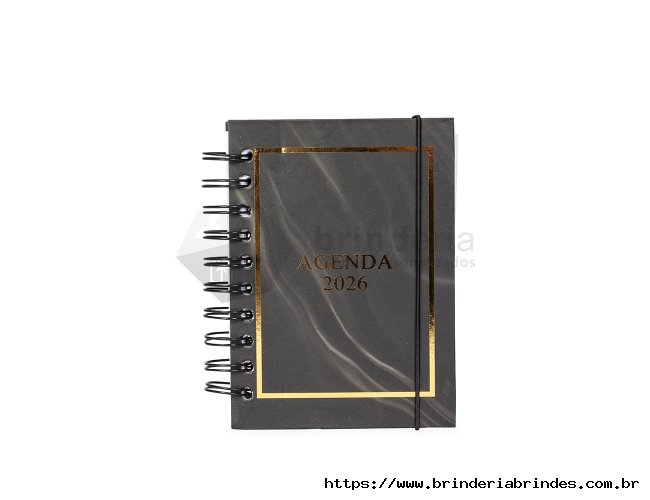 Agenda diária 2026 com capa dura, elástico de fechamento, marca-páginas de fita de cetim e encadernação Wire-O. Conta ainda com páginas dedicadas a dados pessoais, calendários de 2026 até 2028, além de listas de metas, planejamento mensal e contatos.