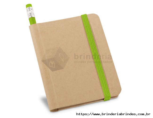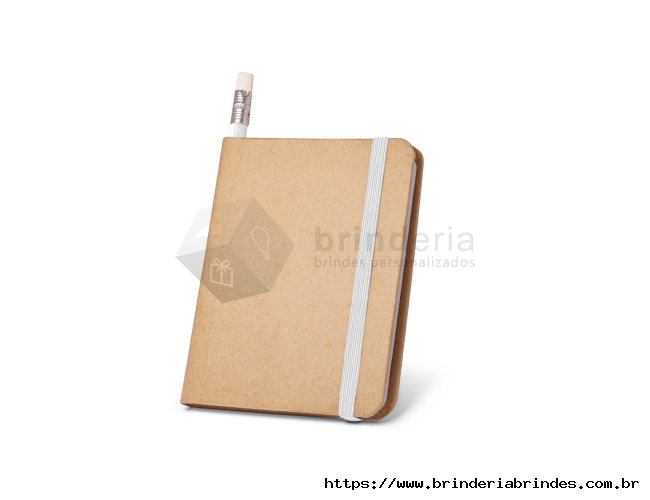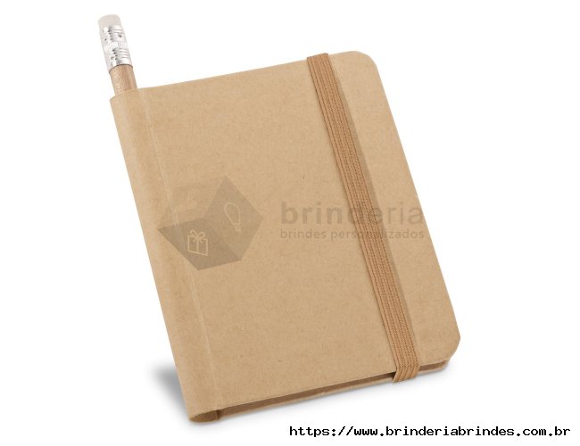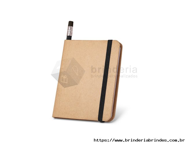 Caderno A7 com 70 folhas não pautadas de papel reciclado, capa dura em cartão e elástico. Incluso lápis com borracha na ponta. 82 x 105 mm