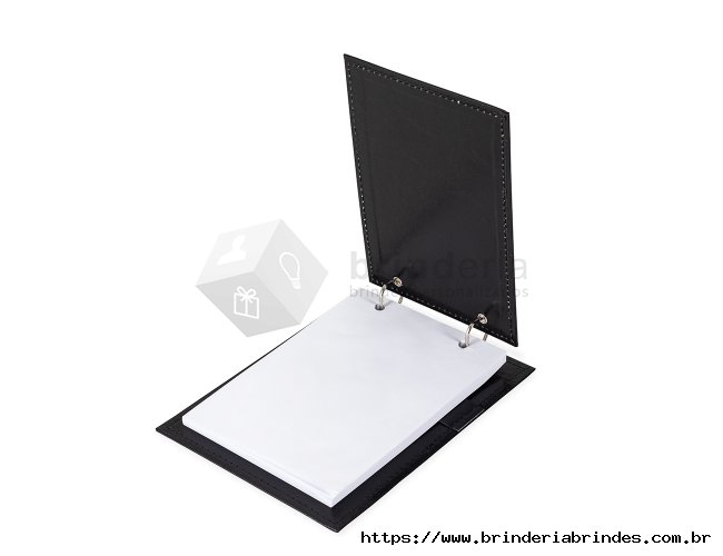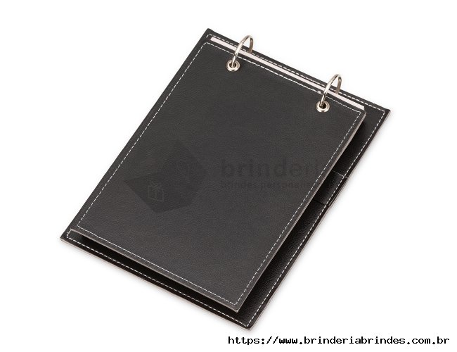 Bloco de anotações de mesa com trilho de ferro, capa em couro sintético. Possui suporte na lateral interna para colocar caneta (não acompanha) e aproximadamente 96 folhas com área destacável.
