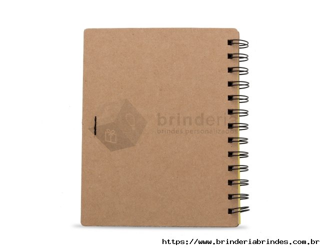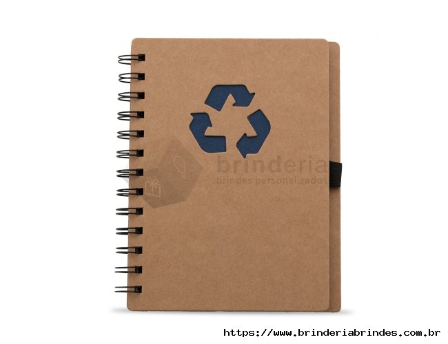 Bloco de anotação ecológico com símbolo reciclado na capa, acompanha as folhas: vermelha, amarela, laranja, azul, verde e preto, possibilitando deixar a cor desejada como fundo do logo reciclado. Possui aproximadamente 70 folhas brancas pautadas com logo reciclado na lateral inferior das folhas, possui também elástico suporte para caneta(não acompanha caneta).