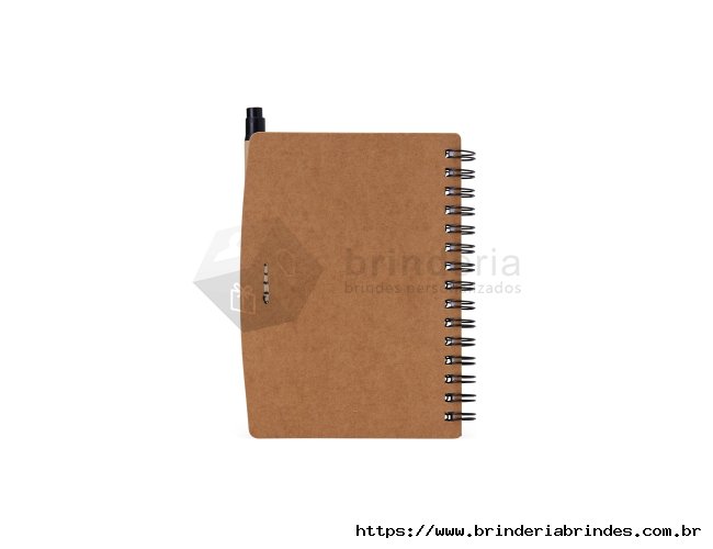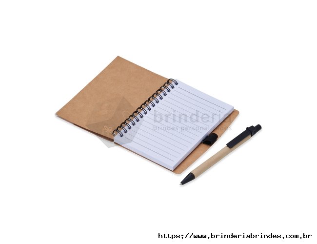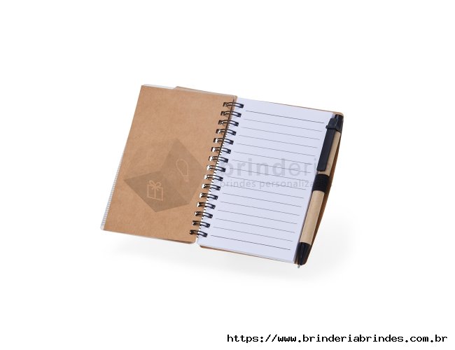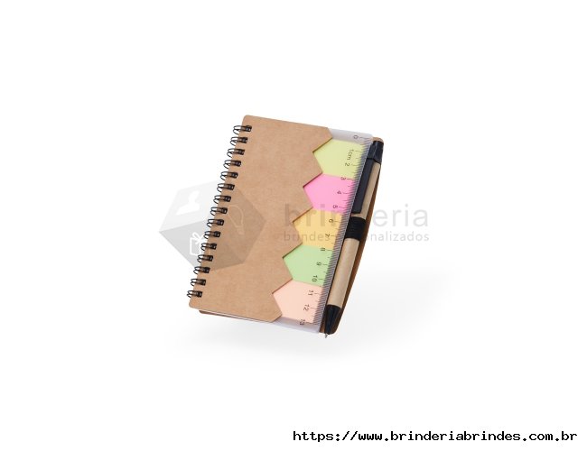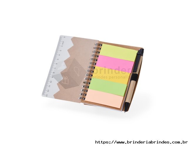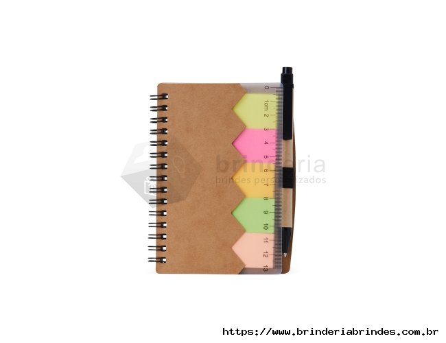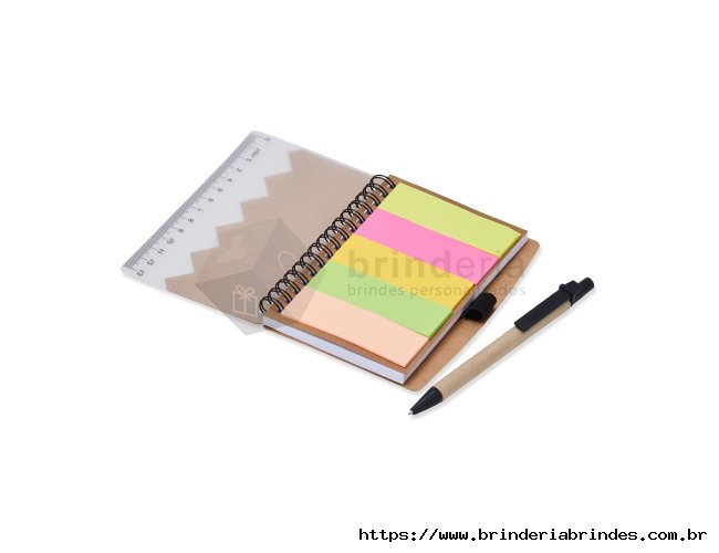 Bloco de anotações ecológico com autoadesivos, régua e caneta, feito em kraft. Contém folha com de régua 13 cm, cinco autoadesivos com aproximadamente 13 folhas, bloco com aproximadamente 69 folhas brancas com pauta, porta caneta elástico e acompanha caneta de papelão com detalhes plásticos, carga esferográfica azul 1.0mm e acionamento por clique.