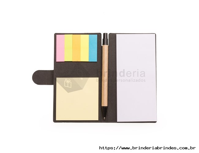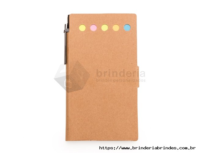 Bloco de anotações ecológico com caneta reciclada. Possui uma trava na própria capa, caneta de papelão com acabamentos em plástico acionada por clique, cinco blocos autoadesivos coloridos com aproximadamente 20 folhas cada, bloco de autoadesivo amarelo com aproximadamente 20 folhas e bloco com aproximadamente 50 folhas brancas sem pauta.