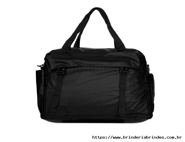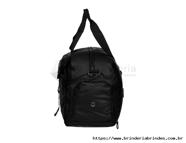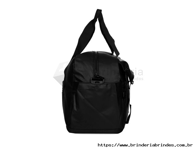 Bolsa impermeável confeccionada em couro sintético, fechamento em zíper e capacidade máxima de 36L quando o compartimento expansível está aberto. Possui compartimento com bolso para itens úmidos e compartimento lateral para tênis, um bolso aberto e outro, em tamanho menor e fechamento em zíper, com espaço posterior para encaixe em puxadores de malas, além de alças de mãos fixas em nylon. Acompanha alça transversal com apoio de ombro.