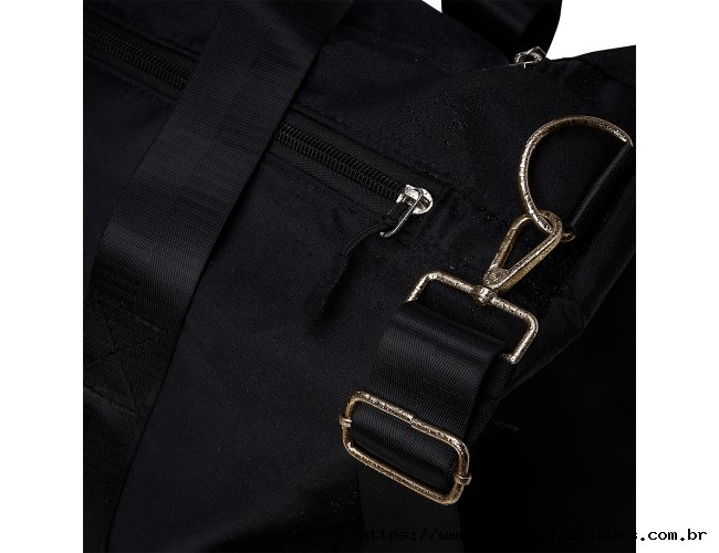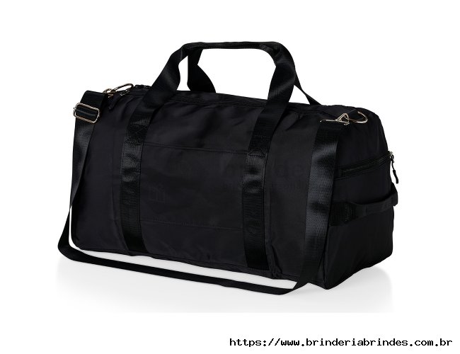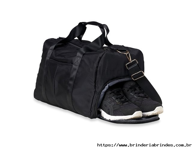 Bolsa esportiva de 36 litros em poliéster resistente à água com cinco compartimentos, sendo dois deles exclusivos para tênis e itens molhados. Contém bolso para encaixe em malas de viagem, bolso interno, alça de mão lateral extra e acompanha alça transversal.