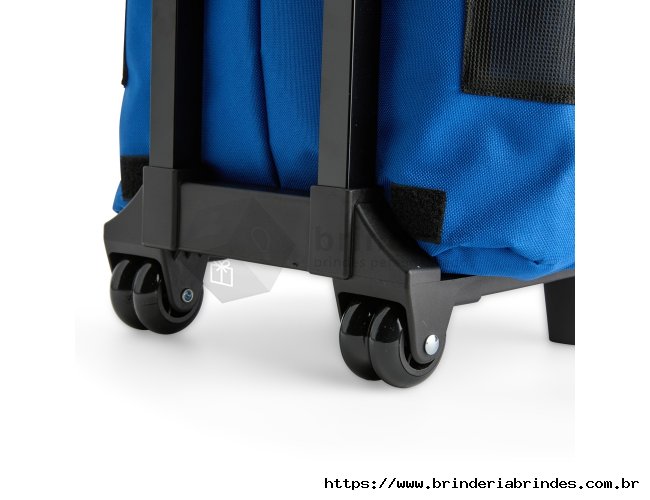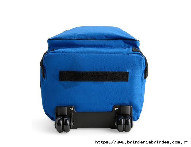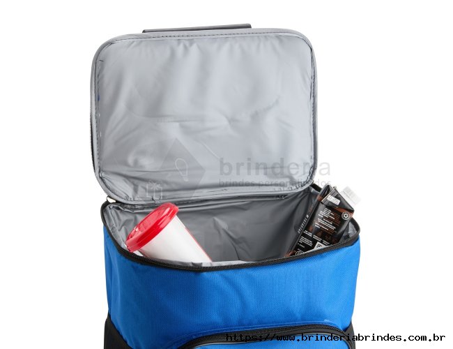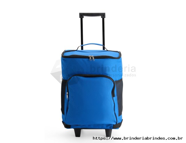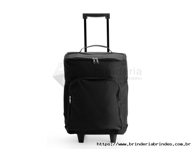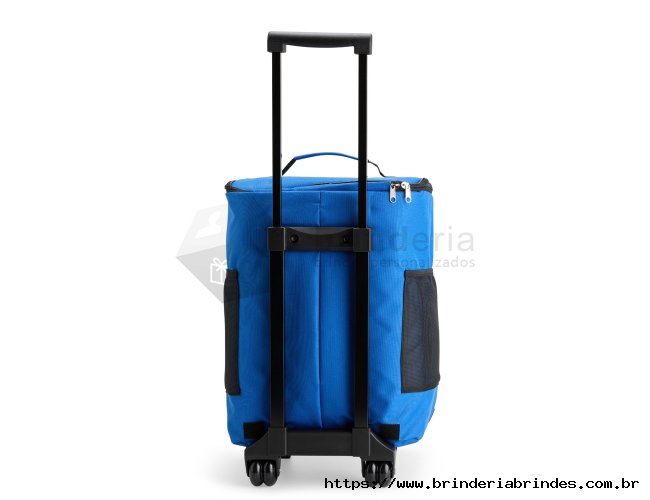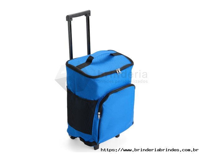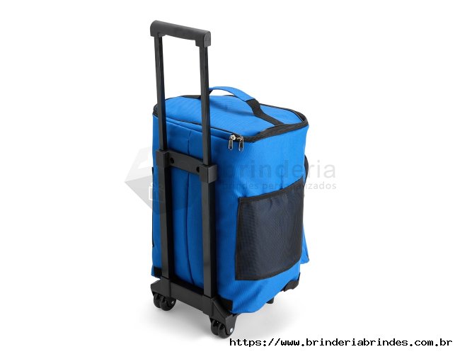 Bolsa térmica confeccionada em poliéster resistente à água e capacidade máxima de 30 litros. Possui compartimento interno com revestimento em PEVA atóxico antivazamento. Dispõe de quatro rodinhas, alça metálica com puxador em plástico, além de freios removíveis com encaixe firme em velcro. Conta ainda com bolso frontal com zíper e dois laterais em tela de nylon.