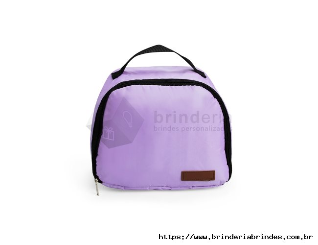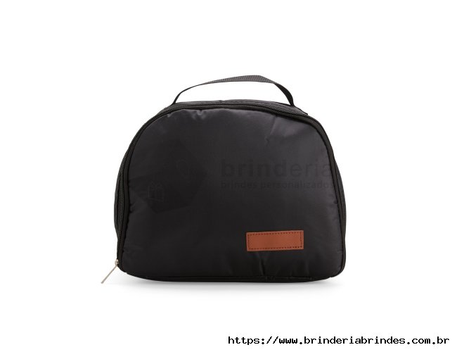 Bolsa térmica em sarja impermeável, com fechamento em zíper e capacidade máxima de 8 litros. Conta com bolso interno em tela de nylon e revestimento térmico em folha de alumínio. Além disso, possui uma pequena placa costurada feita em couro sintético e alça de nylon para transporte.