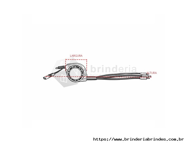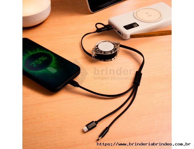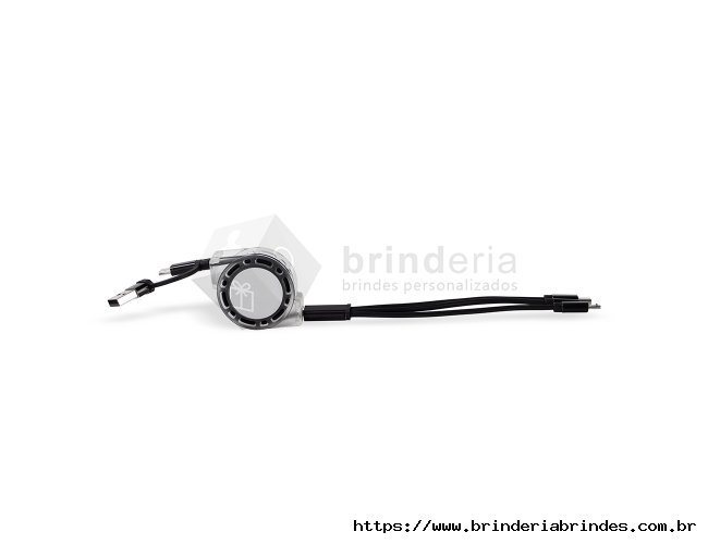 Cabo USB retrátil com níveis ajustáveis e extensão de até 1,05 m. Apresenta três cabos com saídas USB-C, Micro USB e Lightning em uma das pontas, enquanto a outra conta com entrada USB-C e adaptador USB tipo A. Obs.: A transferência de arquivos e dados em dispositivos Android funciona apenas pela saída USB-C.