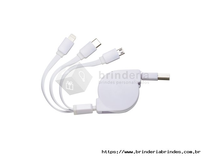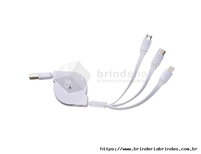 Cabo USB retrátil com as entradas Lightning/iPhone, V8/Android e Tipo-C/Android. Suporte com rolamento e trava automática. Suporte com frente lisa e parte traseira com área para aplicação de adesivo ou etiqueta resinada.