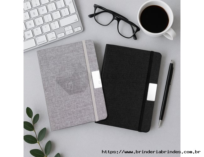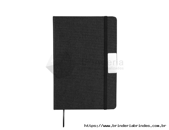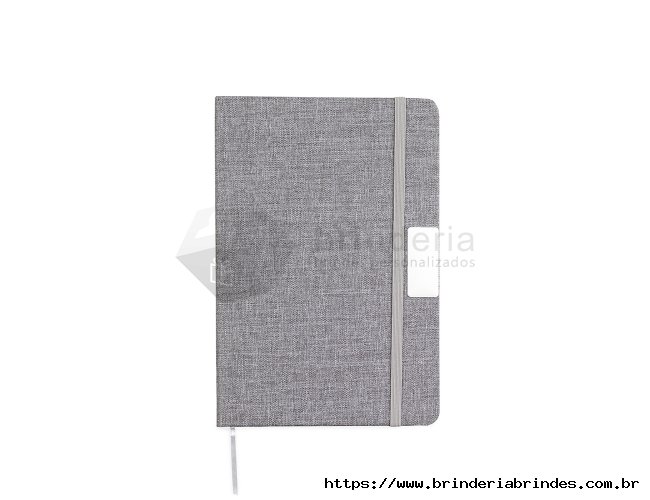 Caderneta em capa com acabamento em tecido de algodão, plaquinha metálica personalizável, elástico para fechamento, marca-páginas em fita de cetim e aproximadamente 96 folhas marfim pautadas.