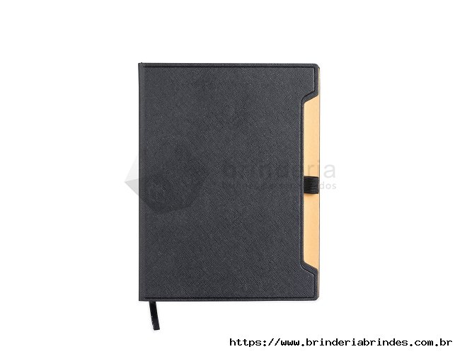 Caderneta com capa em couro sintético, suporte elástico para caneta, marca-páginas em fita de cetim e aproximadamente 96 folhas marfim pautadas.