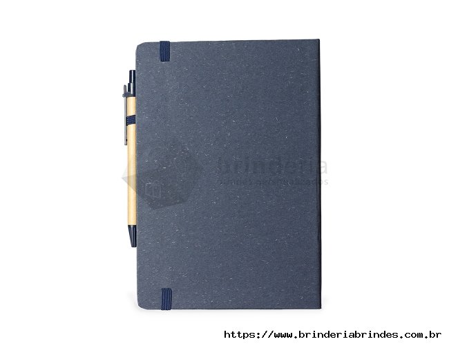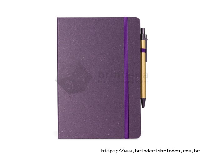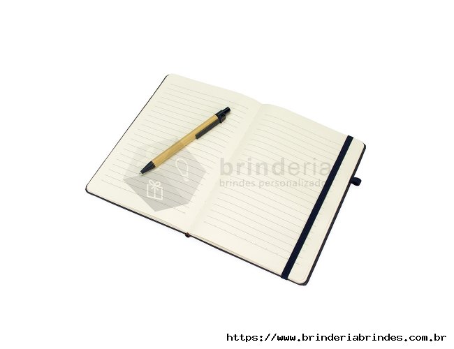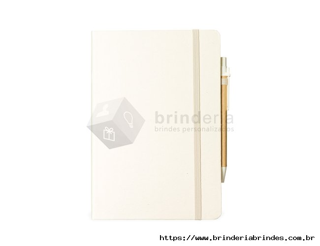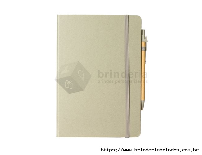 Caderneta ecológica com capa em fibra da palha de arroz. Contém aproximadamente 80 folhas amareladas com pauta, além de duas folhas de guarda, uma fita elástica para fechamento e porta-canetas em elástico. Acompanha uma caneta esferográfica de carga azul de 1,0mm com corpo em papelão e clip, acionamento por clique e ponteira em plástico.