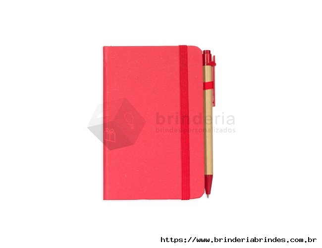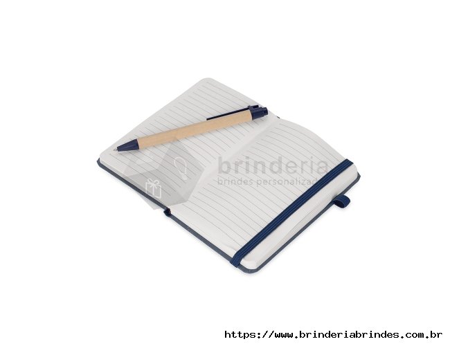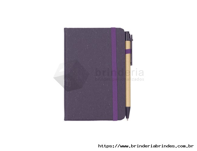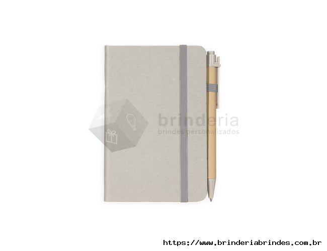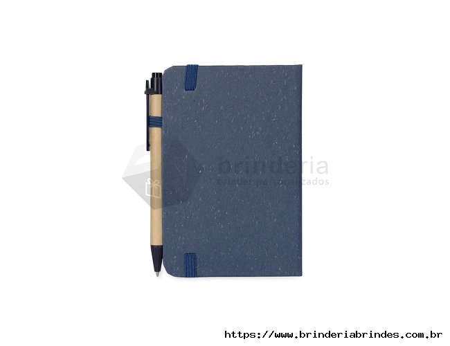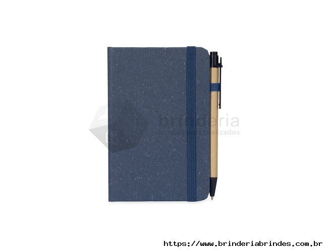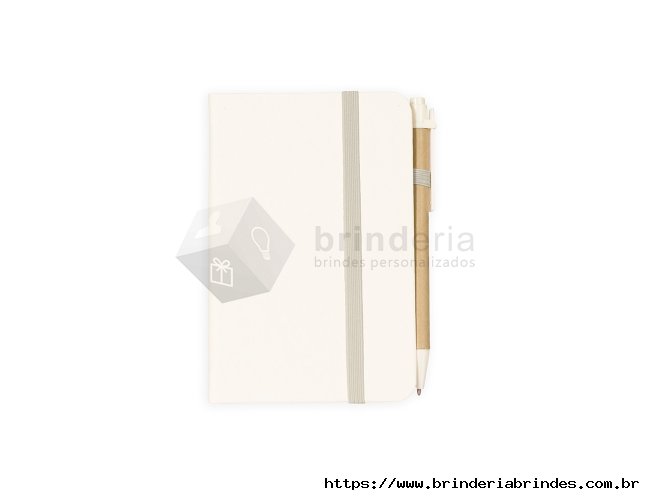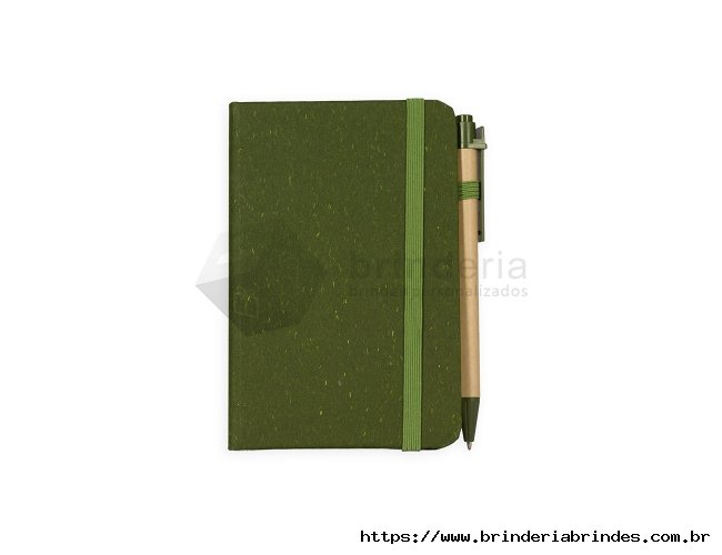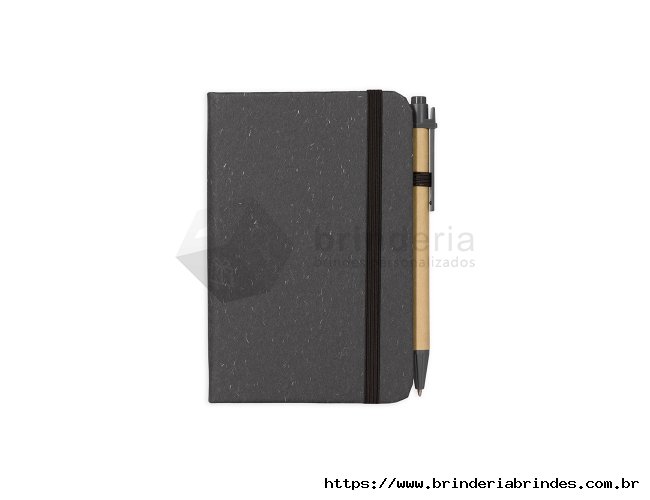 Caderneta ecológica de capa dura revestida em fibra de palha de trigo. Contém aproximadamente 80 folhas brancas com pauta, além de duas folhas de guarda, uma fita para fechamento e porta-canetas elástico. Acompanha uma caneta esferográfica de carga azul de 1,0mm com corpo em papelão e clip, acionamento por clique e ponteira em plástico.