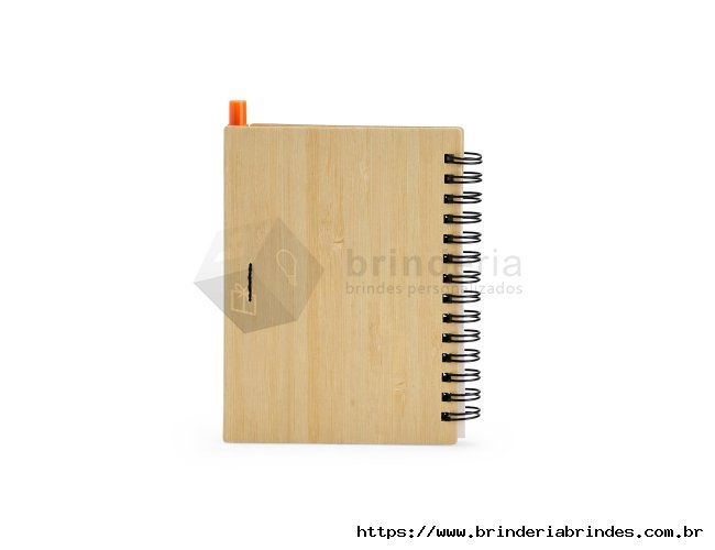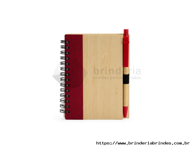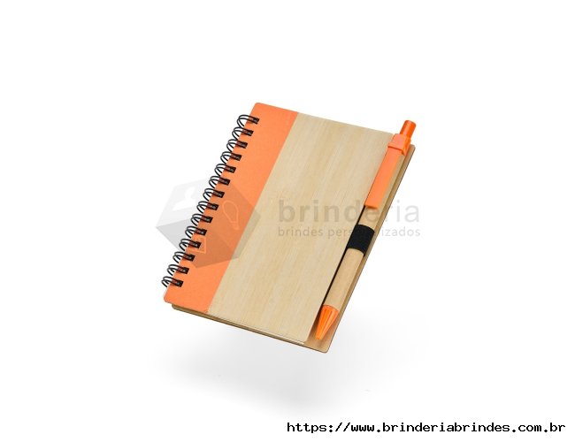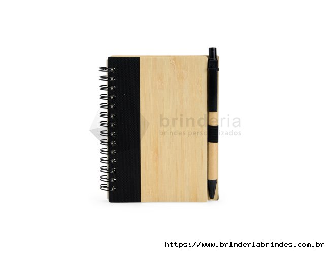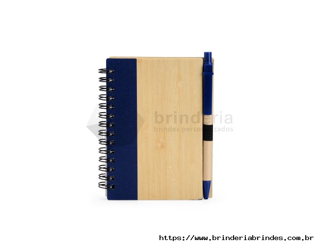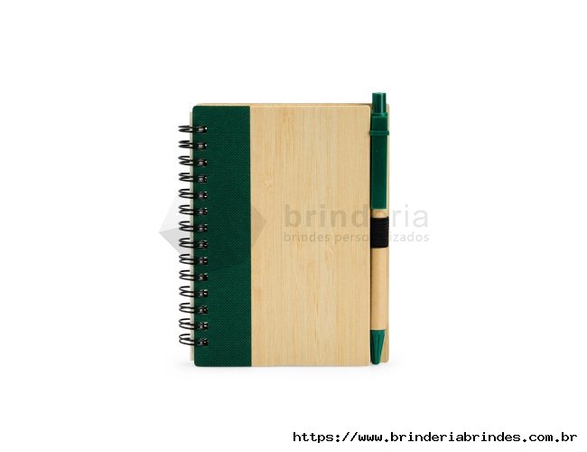 Um caderno feito para quem deseja anotar ideias e projetos sem abandonar a preocupação com o meio ambiente. Com capa feita em casca de bambu e faixa vertical colorida, ele conta também com encadernação Wire-O e aproximadamente 70 folhas amareladas pautadas. Além disso, o caderno acompanha uma caneta esferográfica de carga azul de 0,8 mm com corpo em papelão e clip, acionamento em clique e ponteira em plástico. A capa contém um elástico para abrigar a caneta junto ao caderno.
