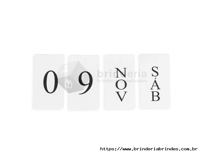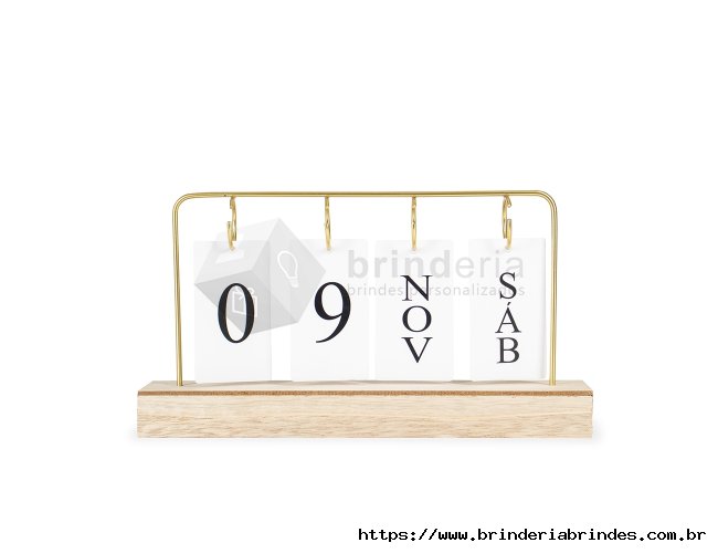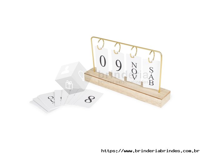 Calendário permanente de mesa com base feita em MDF e moldura de ferro. Conta com fichas em papel cartão que permitem montar a data, trazendo o dia em números e o mês e os dias da semana em versões abreviadas.
