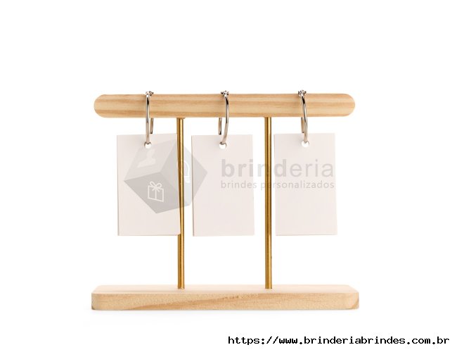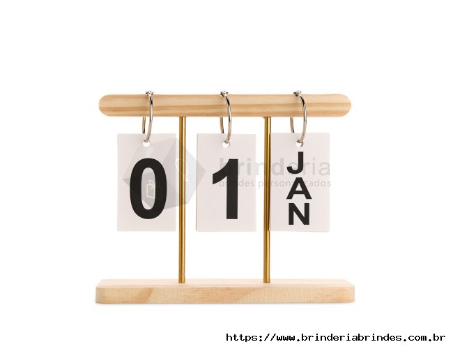 Calendário permanente de mesa com estrutura em madeira e metal. Conta com fichas em papel cartão que exibem os dias e os meses, além de argolas metálicas para organizar as fichas e deixar a montagem intuitiva.