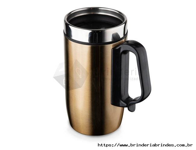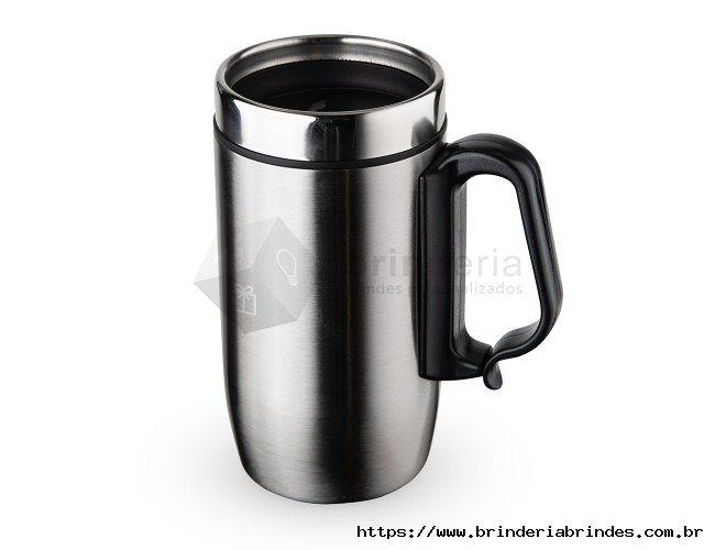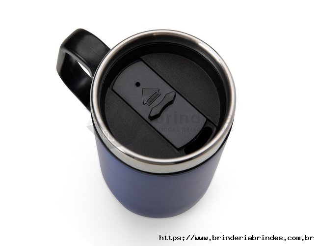 Caneca 275 ml parede dupla em Inox, com pegador de plástico, contém tampa com compartimento que ao deslizar, pode ser aberto para beber e base com EVA antiderrapante.