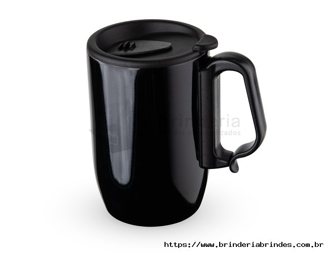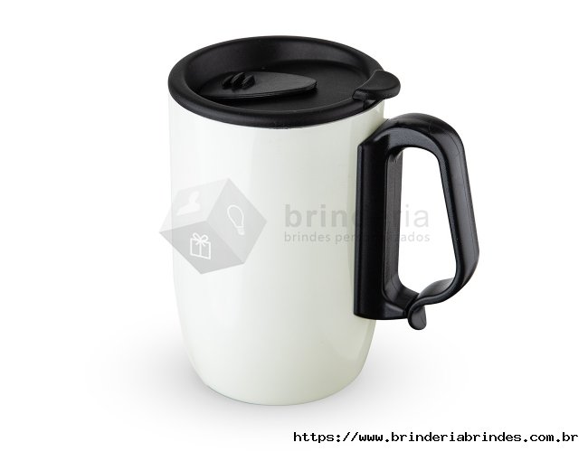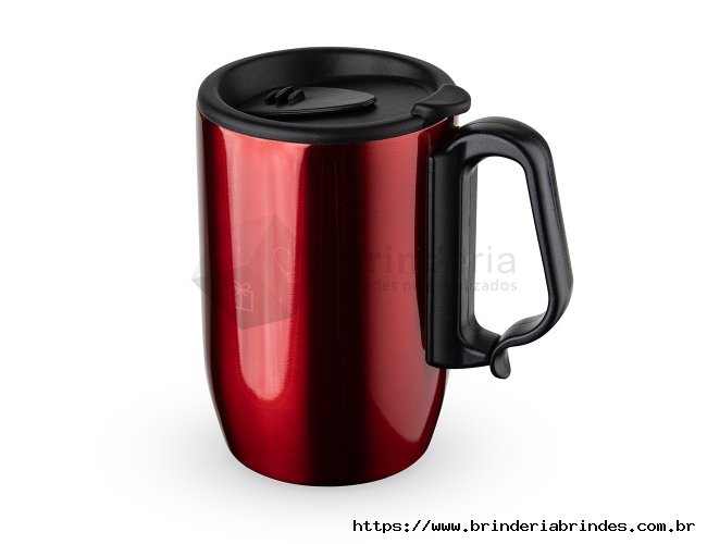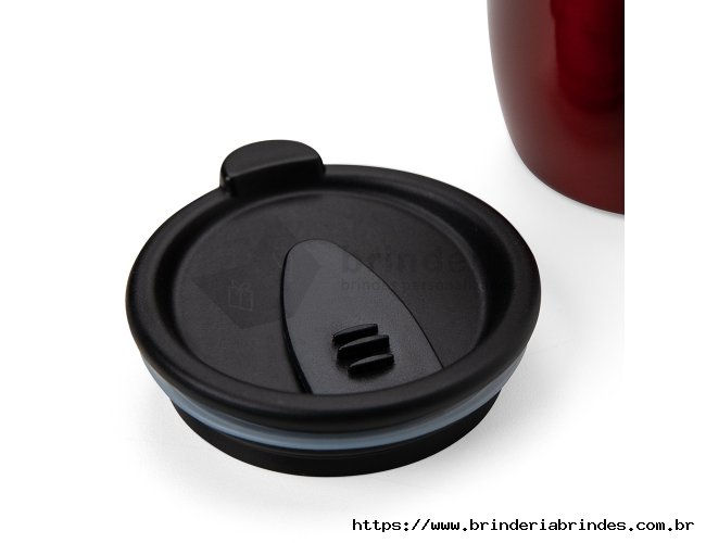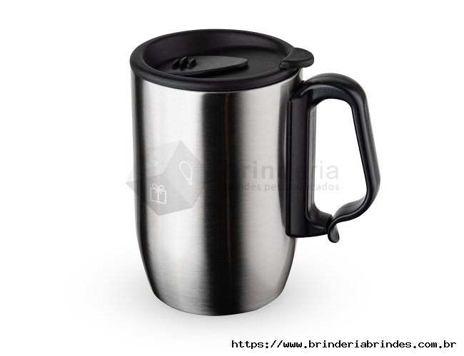 Caneca 350 ml parede dupla em Inox, com pegador de plástico, contém tampa com compartimento que ao deslizar, pode ser aberto para beber e base com EVA antiderrapante.
