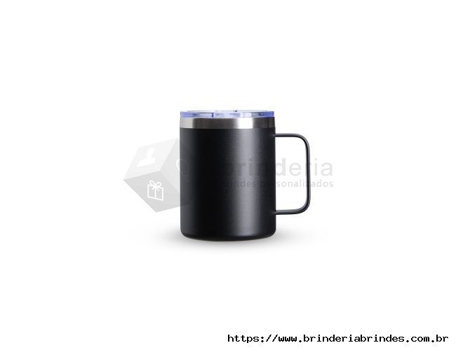 Caneca térmica de inox 350ml com parede dupla. Contém tampa acrílica com bocal e trava de segurança.