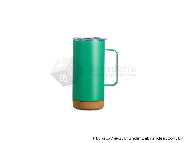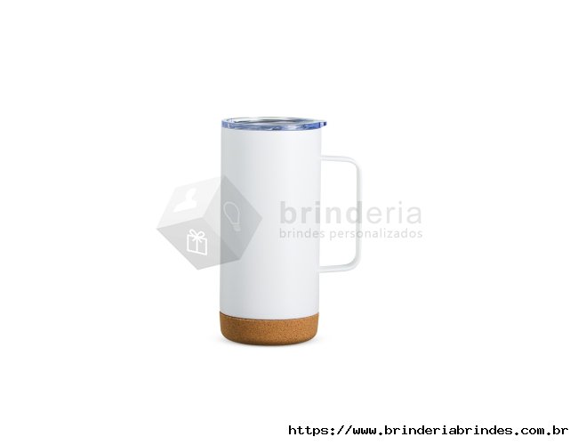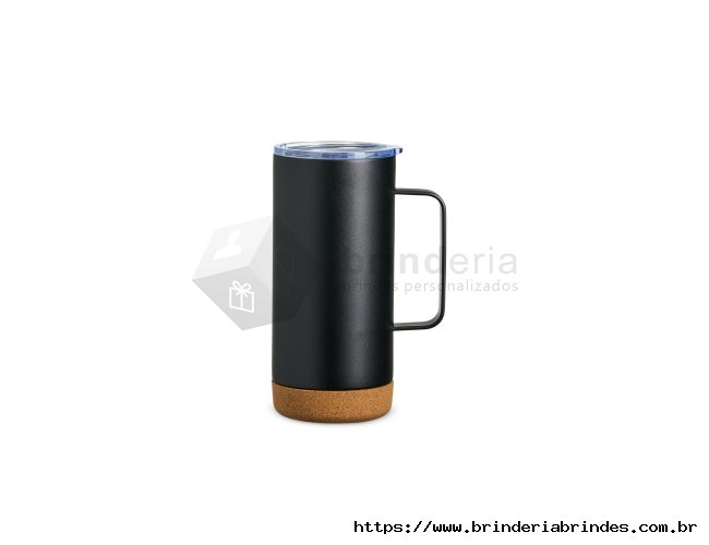 Caneca Térmica de 500ml feita em inox com fundo de cortiça, tampa com bocal e trava de segurança. Um item que alia a elegância da cortiça com o inox.