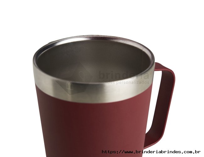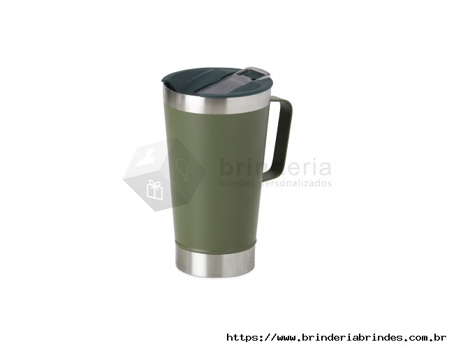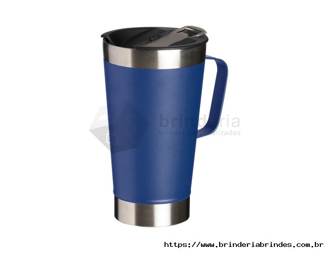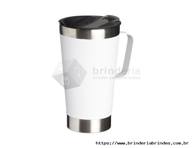 Caneca térmica de inox com capacidade para 500ml. Acompanha uma tampa de plástico e um abridor de garrafas. O abridor fica preso em um encaixe existente na tampa, porém é removível.
