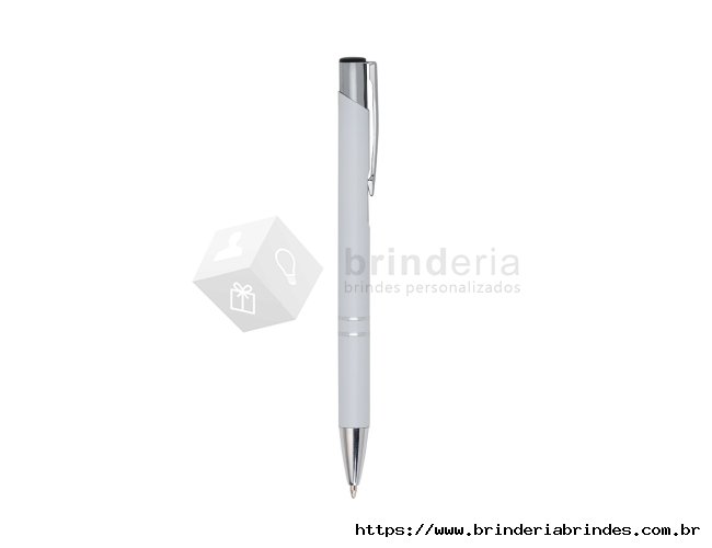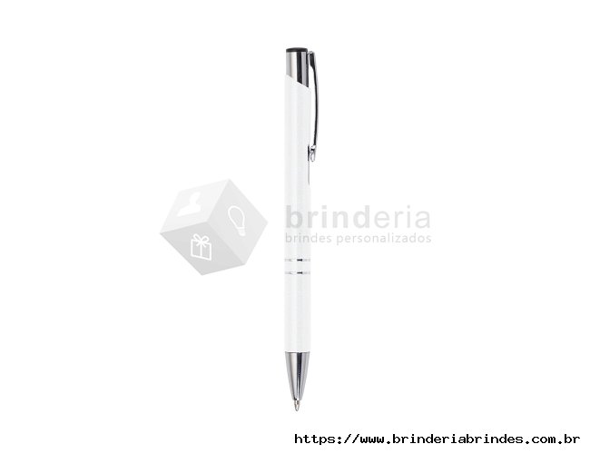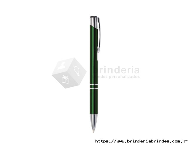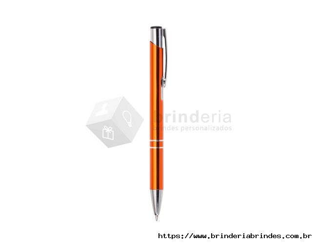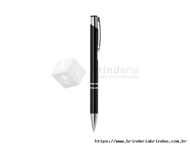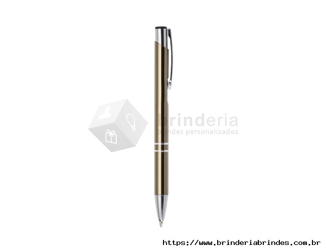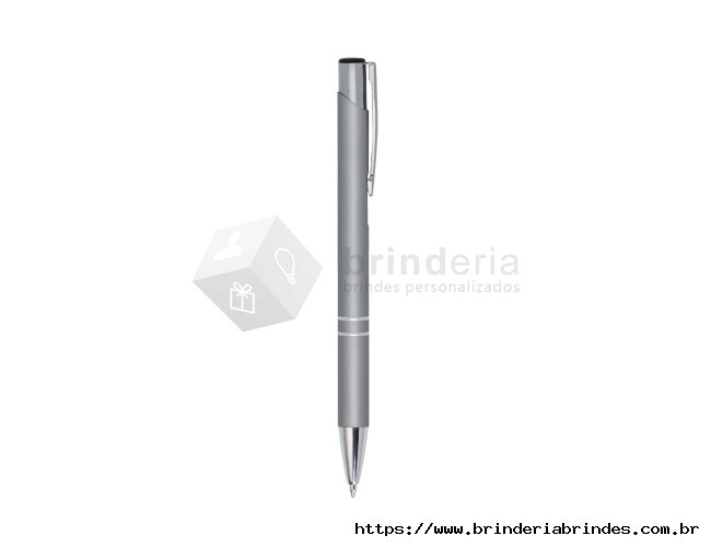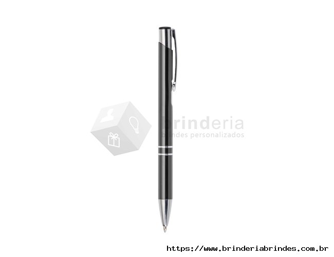 Caneta metálica com carga esferográfica azul e acionamento por clique.