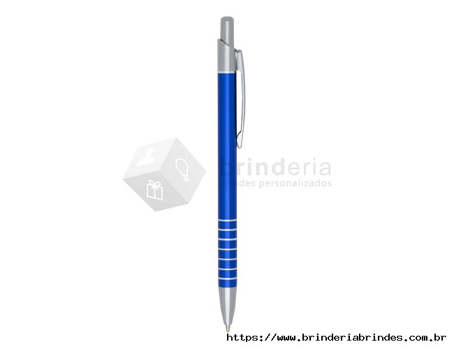 Caneta metálica com carga esferográfica azul e acionamento por clique.