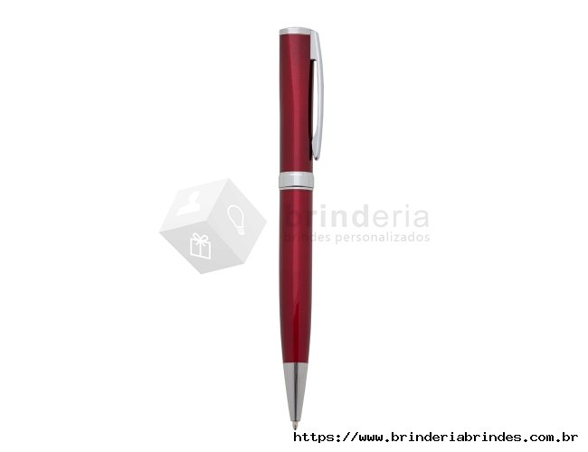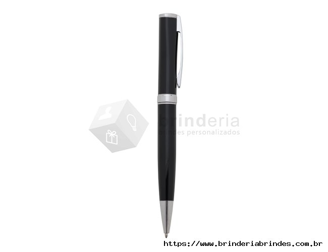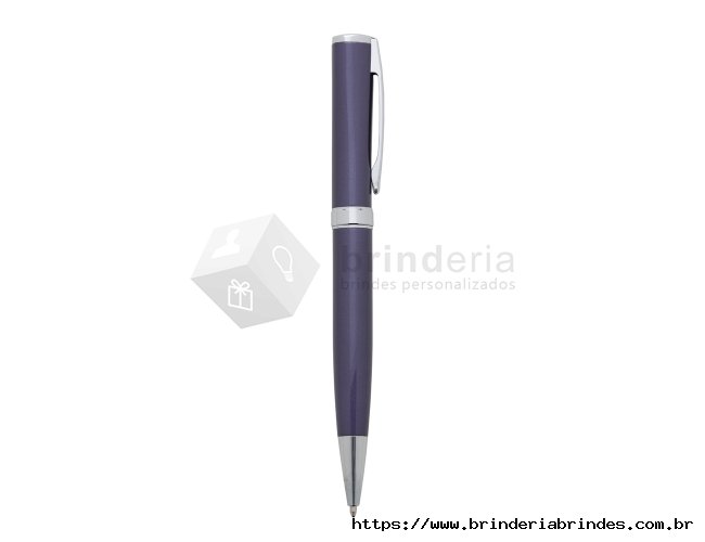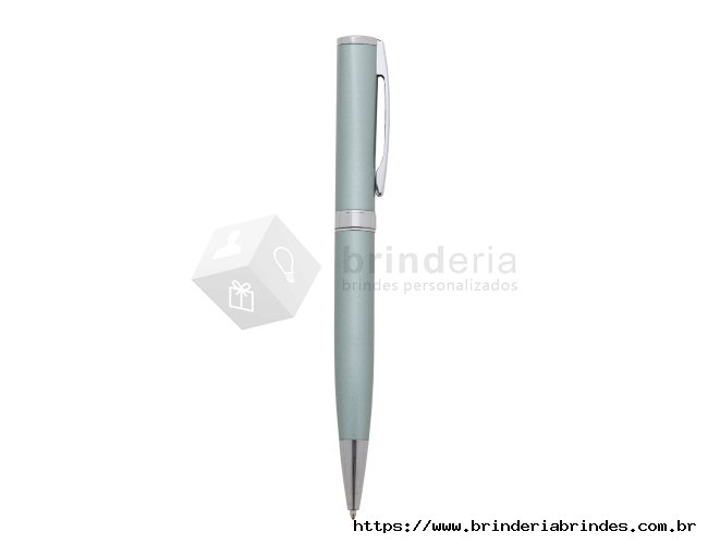 Caneta metálica com carga esferográfica azul e acionamento por rotação.