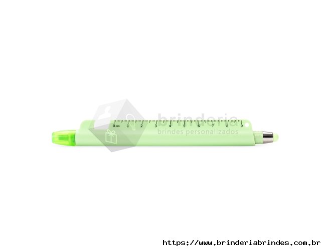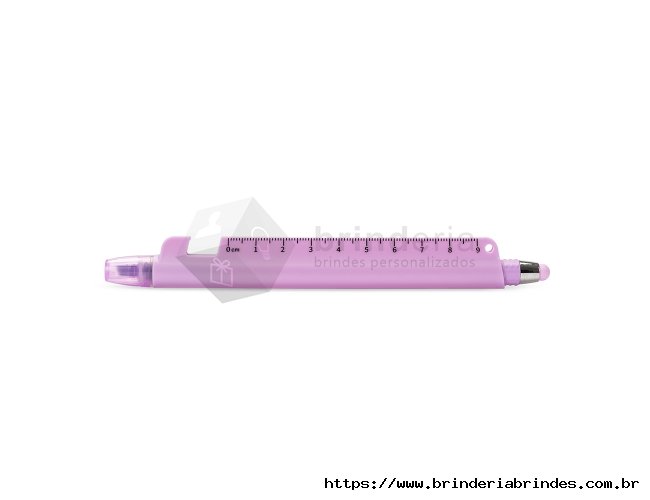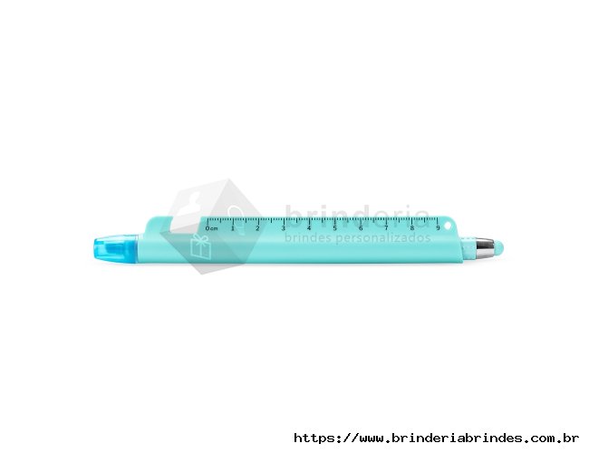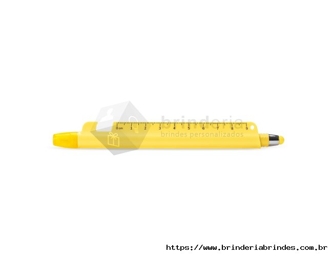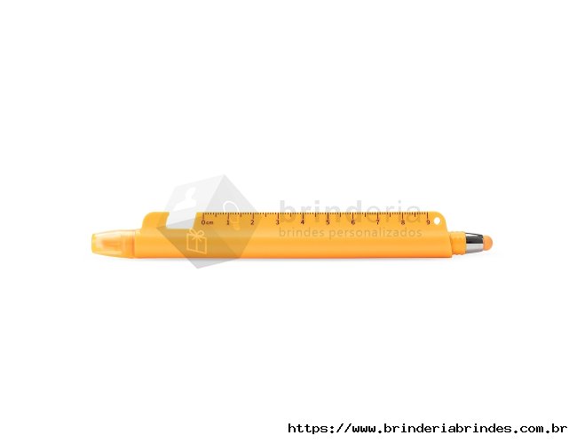 Caneta plástica marca-texto de ponta chanfrada com tampa protetora. Conta ainda com régua de 9 centímetros e abridor de garrafas integrados ao corpo da caneta, além de ponteira emborrachada para interação com telas sensíveis ao toque.