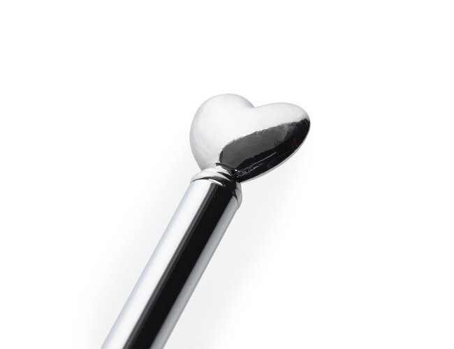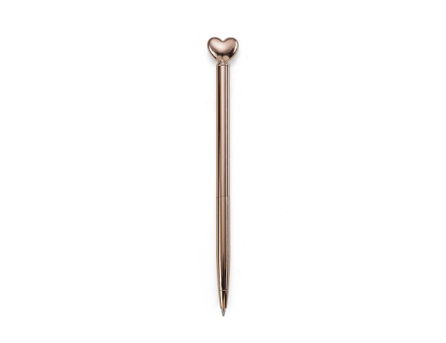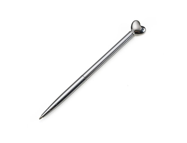 Caneta metálica com carga esferográfica azul e acionamento por rotação.
