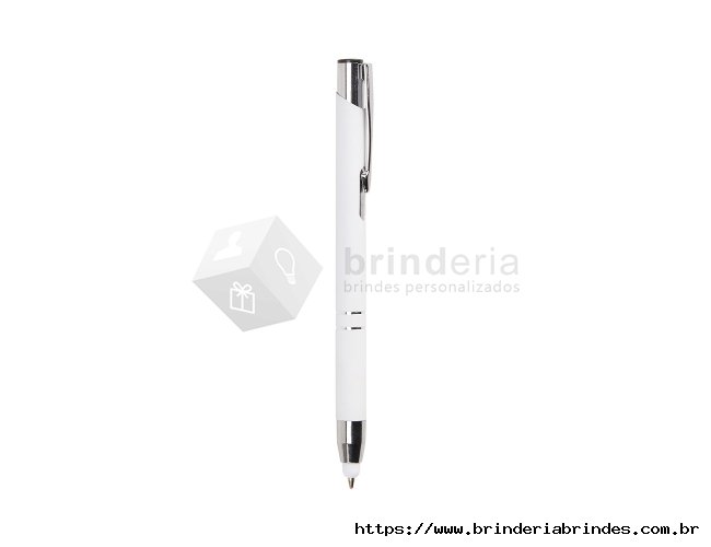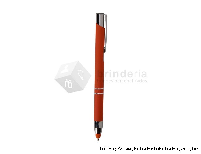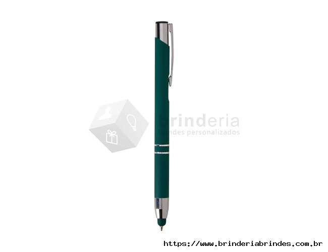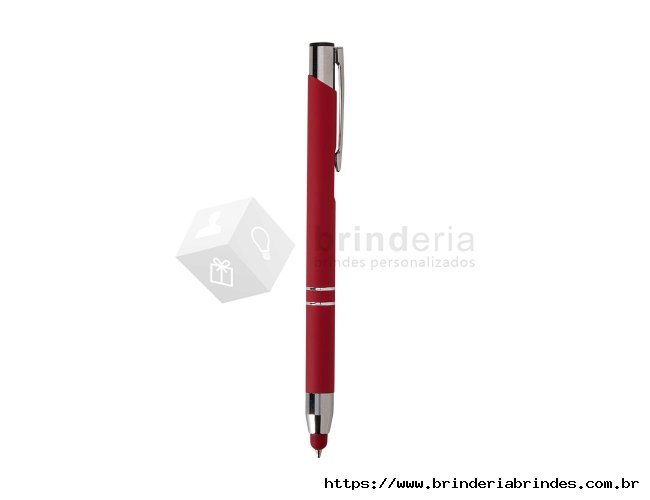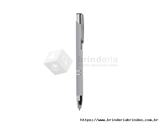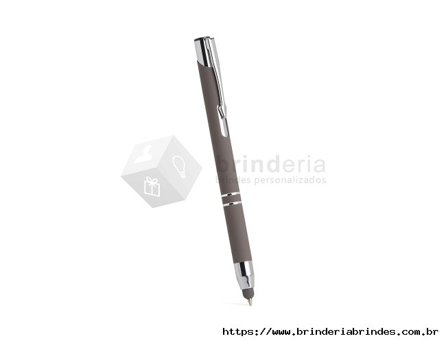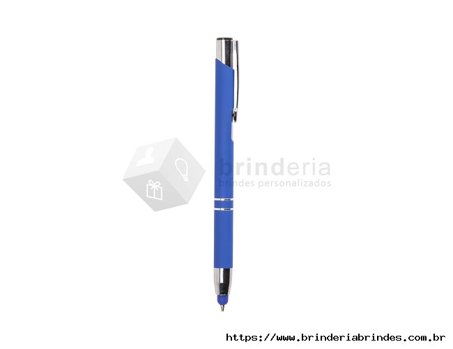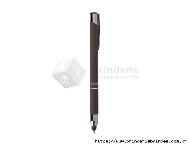 Caneta esferográfica com carga azul de 1.0mm e acionamento por clique. De construção metálica, também possui ponteira emborrachada que permite seu uso como uma caneta touch para interação com dispositivos de tela sensível ao toque.