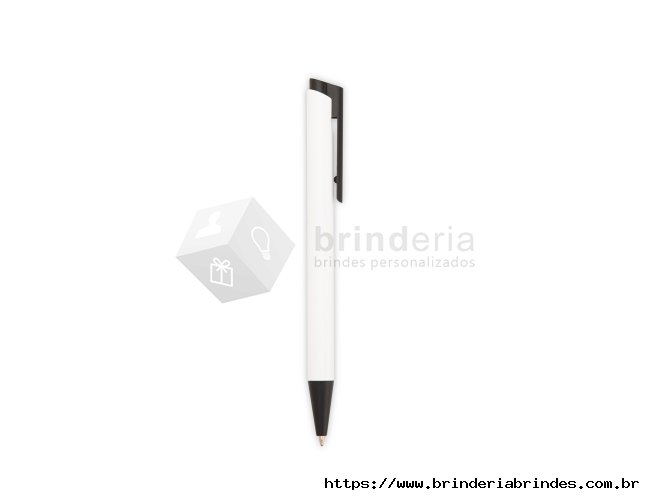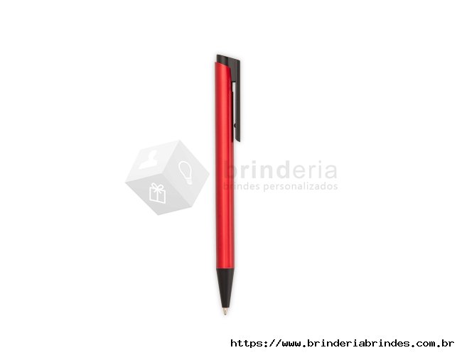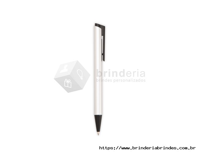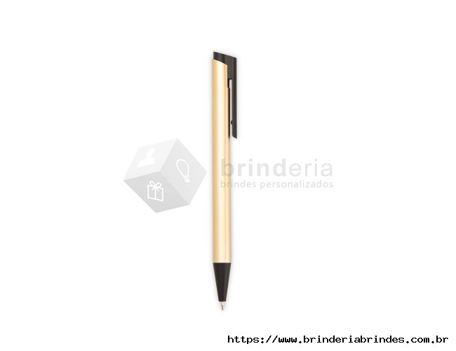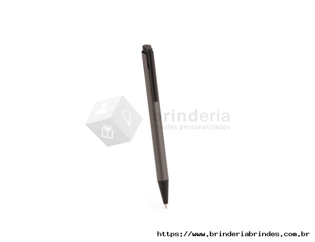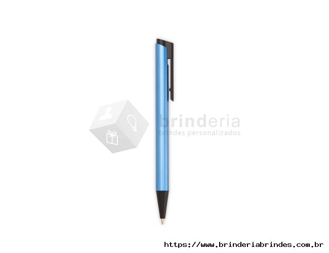 Caneta metálica com ponteira, clip e acionamento em plástico. Possui carga esferográfica azul de 1,0mm e acionamento por clique.