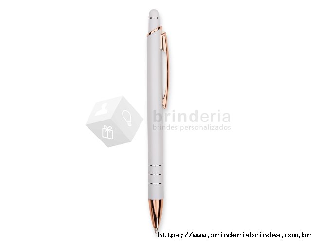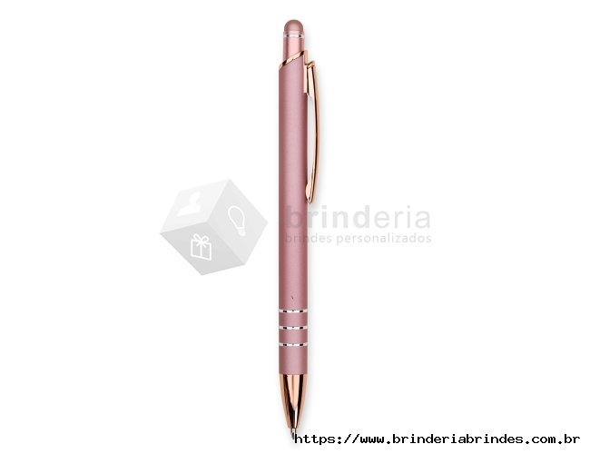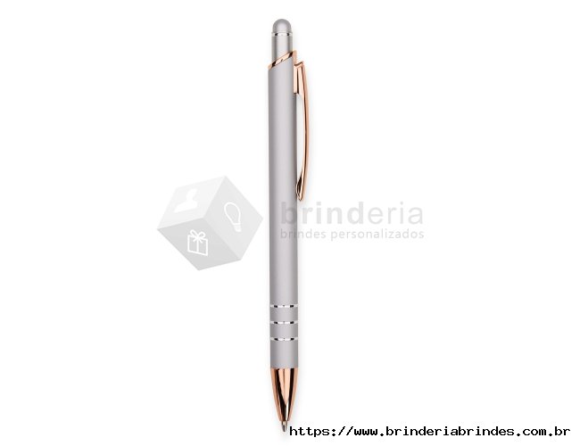 Caneta metálica com acionador touch, clipe metálico e ponteira plástica. Carga esferográfica azul 1.0mm e acionamento por clique.