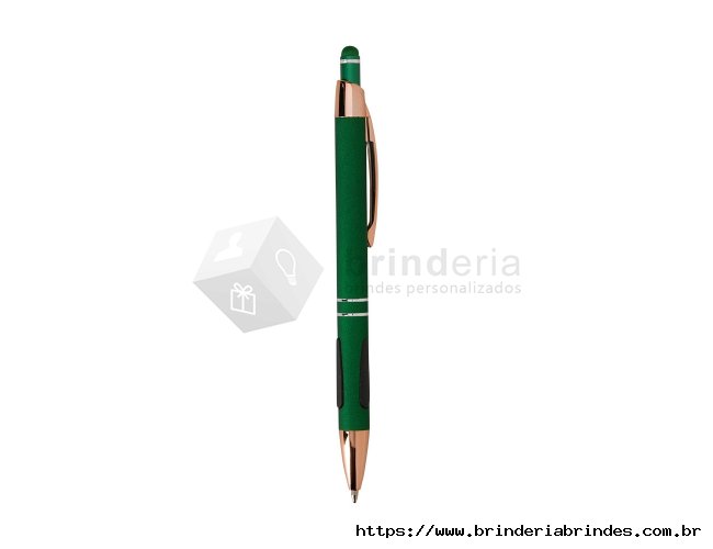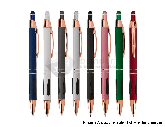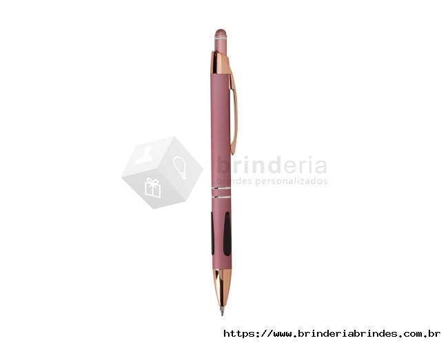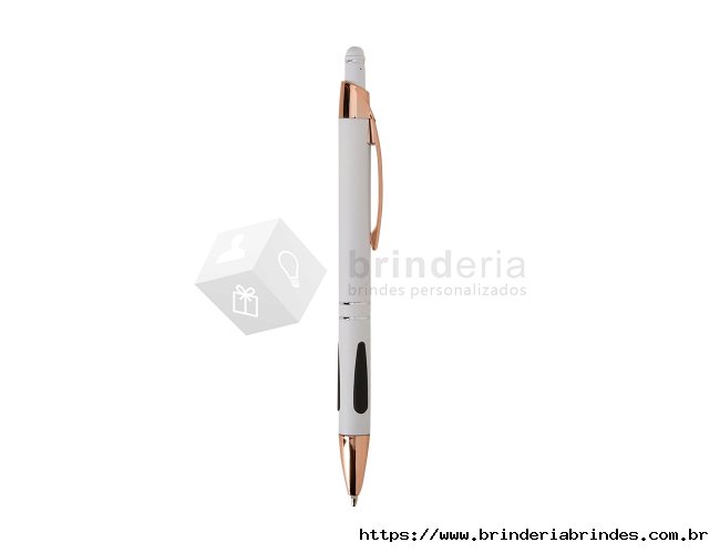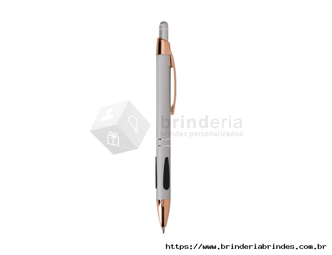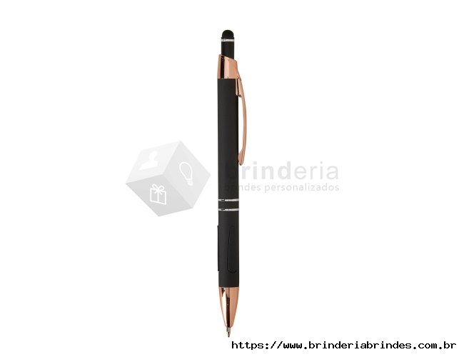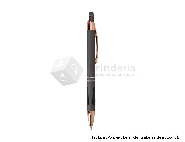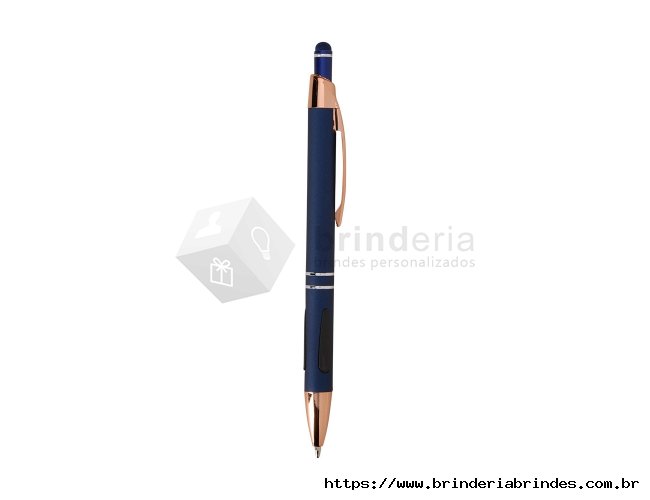 Caneta em metal com detalhes emborrachados, carga esferográfica azul de 1.0mm e acionamento por clique com acabamento emborrachado que permite seu uso como uma caneta touch para interação com dispositivos de tela sensível ao toque.