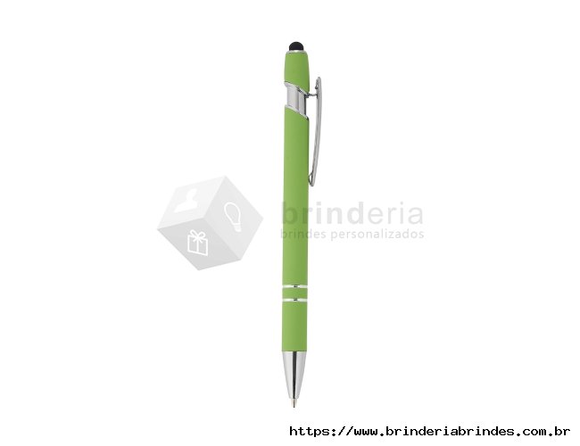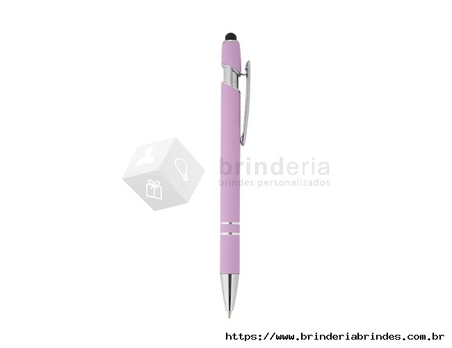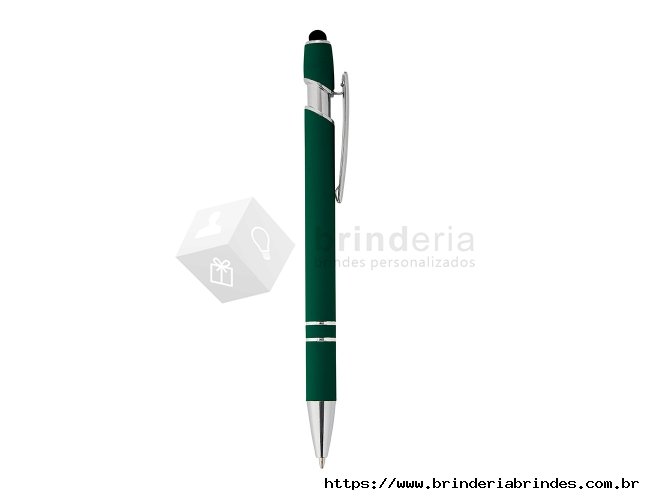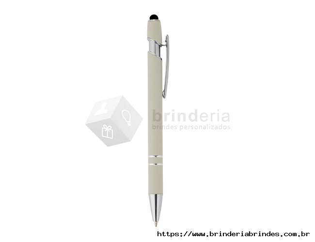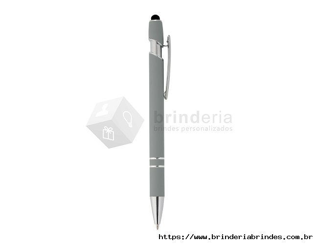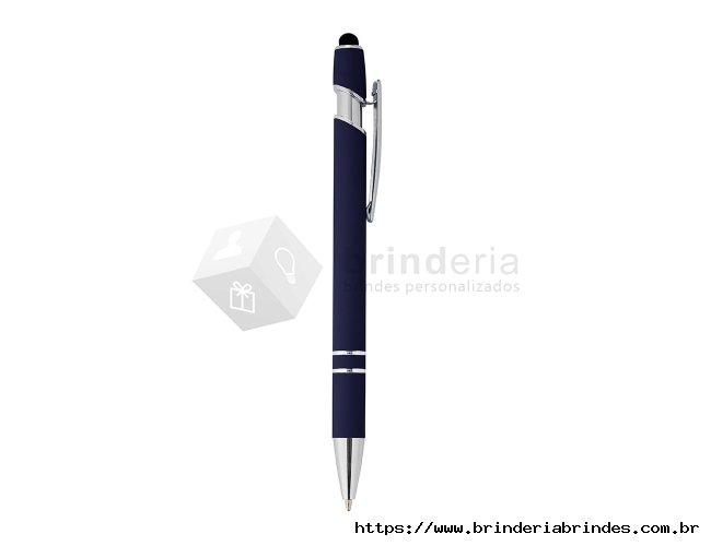 Caneta metálica touchscreen com acabamento similar à borracha, acionamento por clique e carga esferográfica azul 1.0mm.