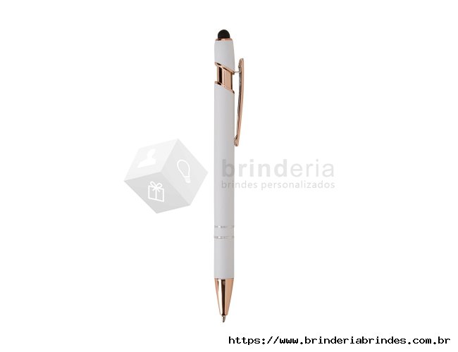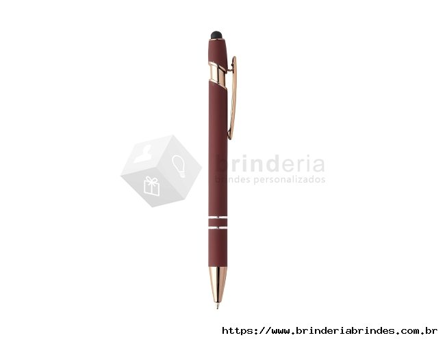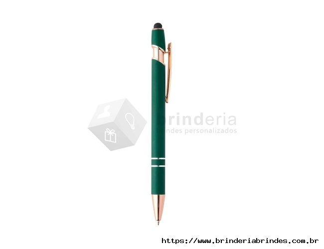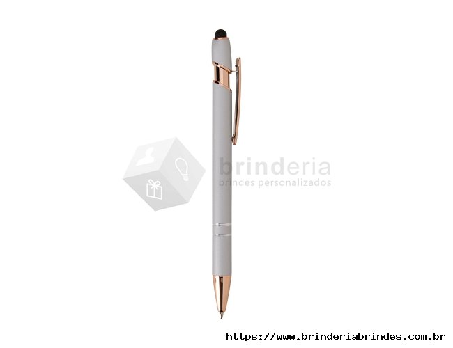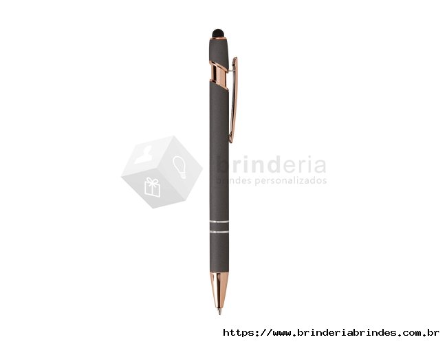 Caneta metálica touchscreen com acabamento similar à borracha, acionamento por clique e carga esferográfica azul 1.0mm.