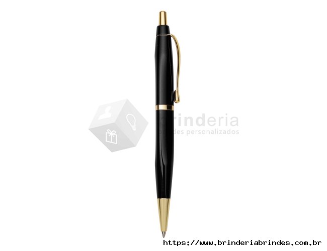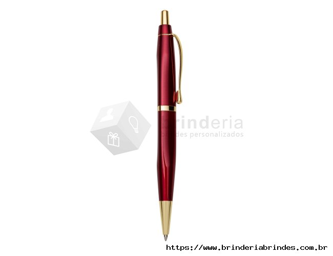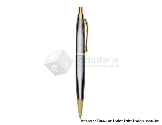 Caneta metal triangular com pintura colorida e detalhes dourados. Clip metálico, acionador, anel e ponteira dourada. Aciona por clique. OBS.: PEDIDO APENAS MÚLTIPLO DE 50 PEÇAS!