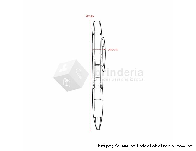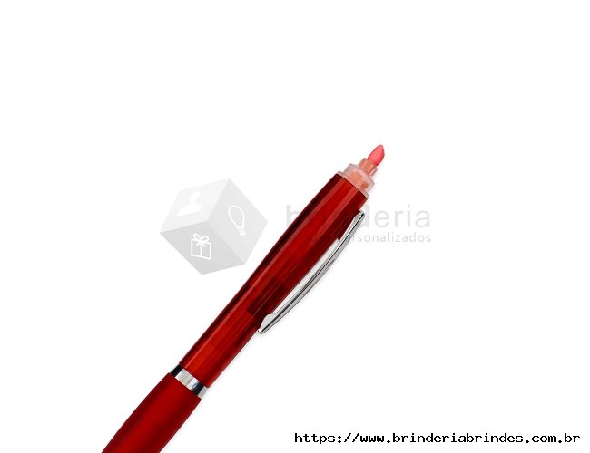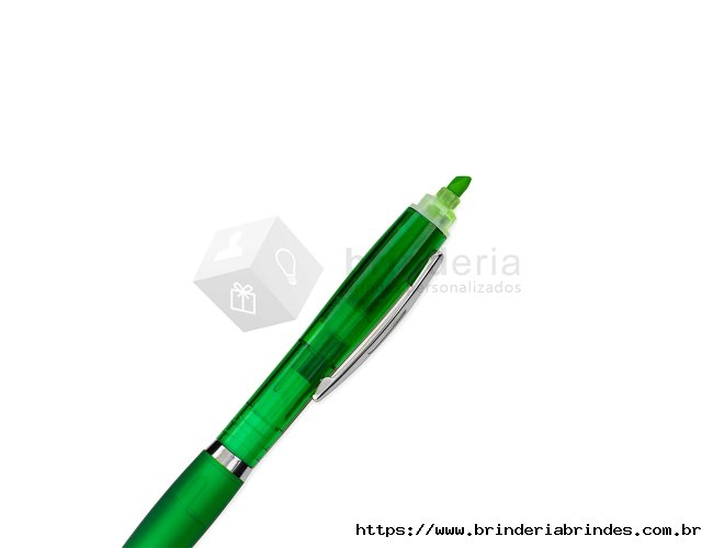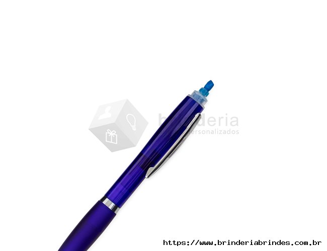 Caneta plástica com marca-texto e tampa protetora localizados no topo. Possui clip e ponteira em metal, acionamento por rotação e ponta esferográfica azul de 1.0mm.
