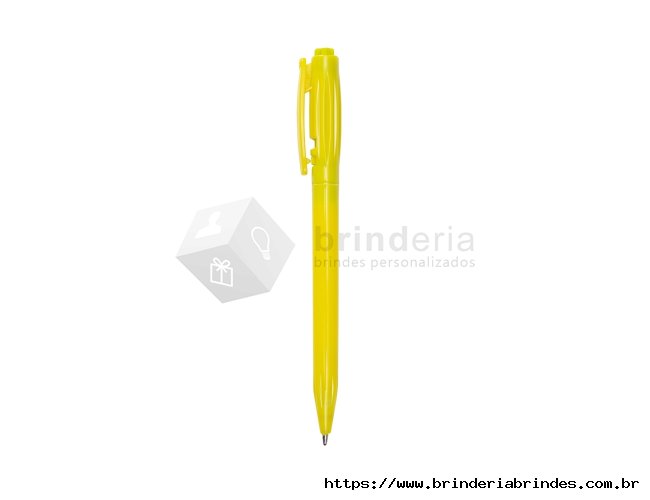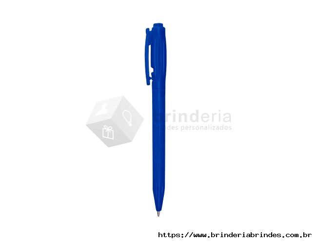 Caneta plástica translúcida com carga esferográfica azul e acionamento por clique.