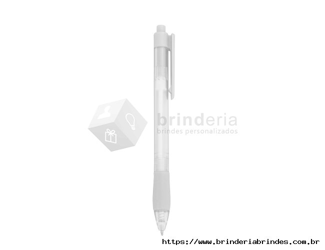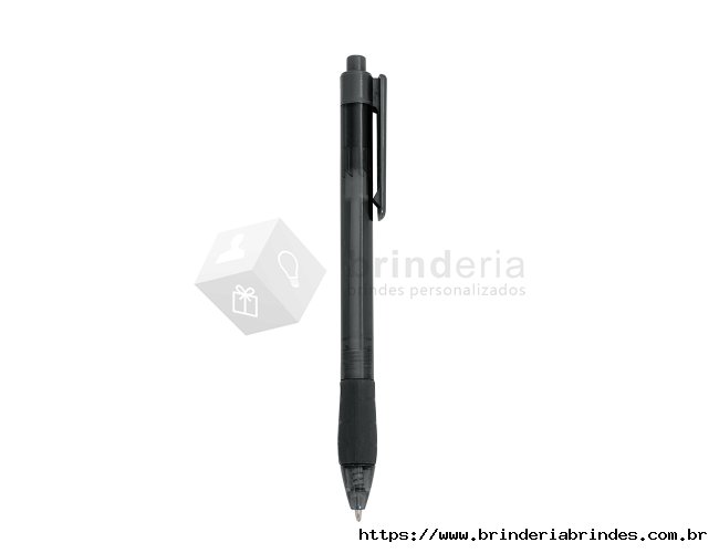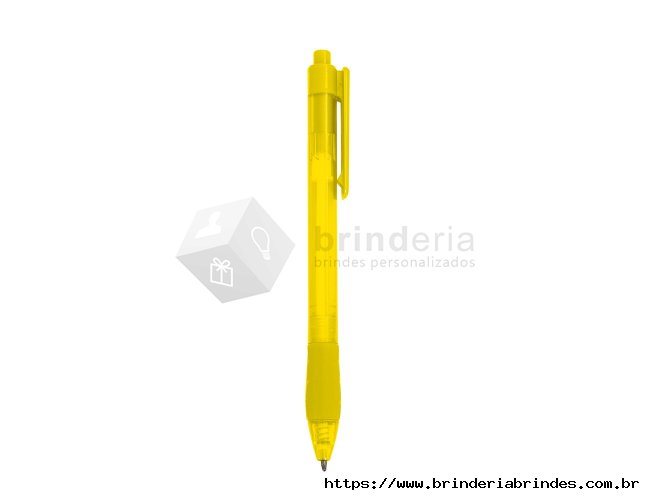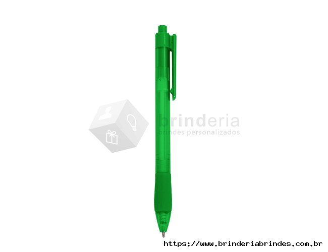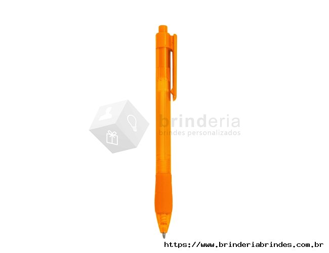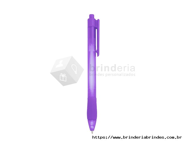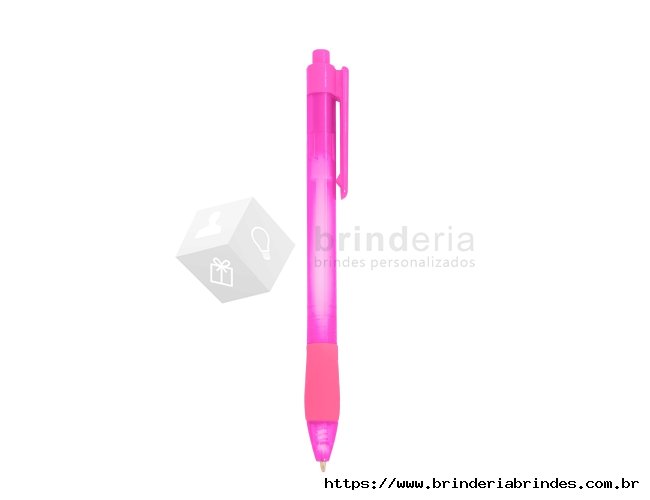 caneta plástica translúcida colorida com detalhe inferior emborrachado. Aciona por clique.
