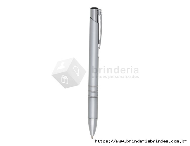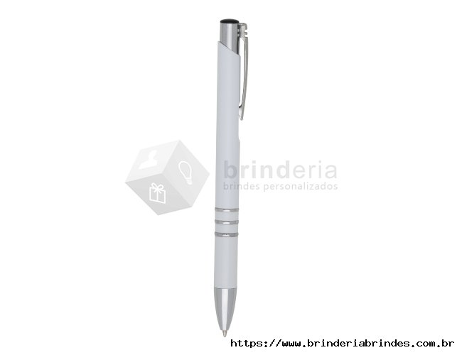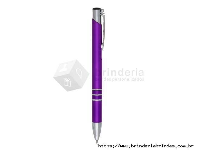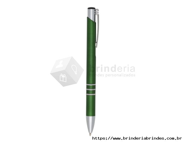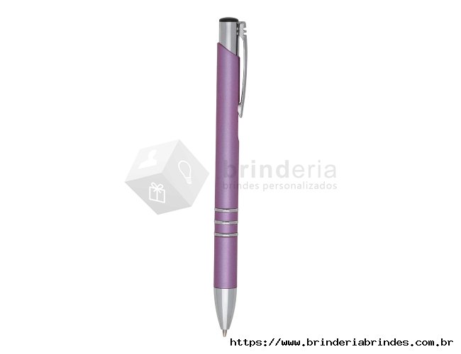 Caneta plástica inteira colorida com detalhes em prata. Ponta do acionador preto e clip metal, possui 3 anéis inferiores. Aciona por clique.
