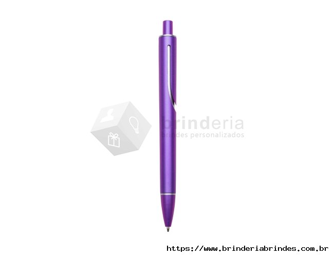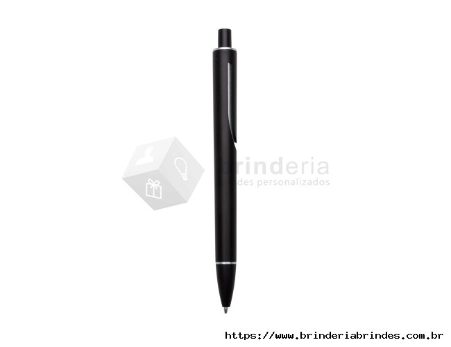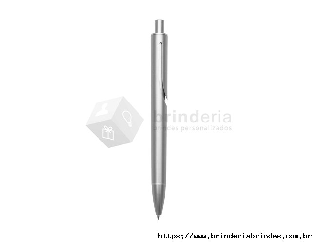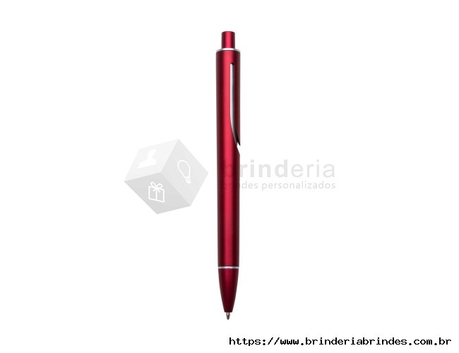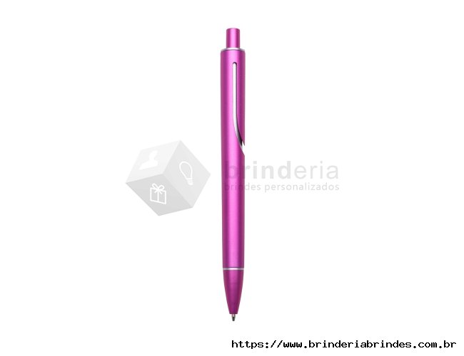 Caneta plástica inteira colorida com detalhes prata. Clip "acoplado" ao corpo da caneta, possui anel superior e inferior prata. Aciona por clique.