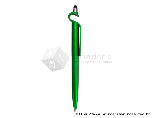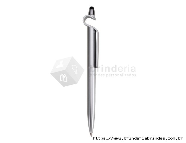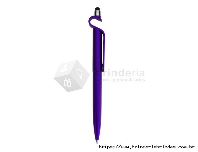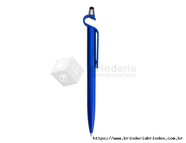 Caneta plástica com suporte para celular e touch screen. Carga esferográfica azul e acionamento por rotação.