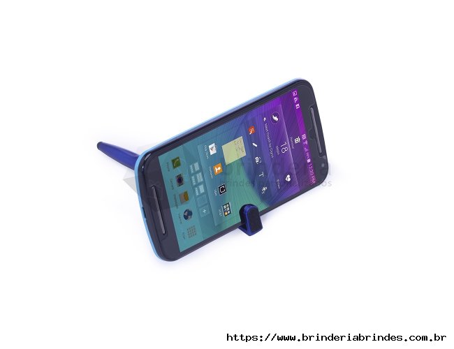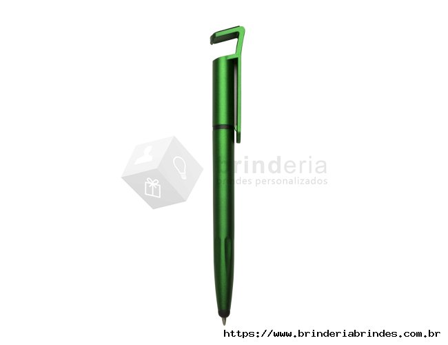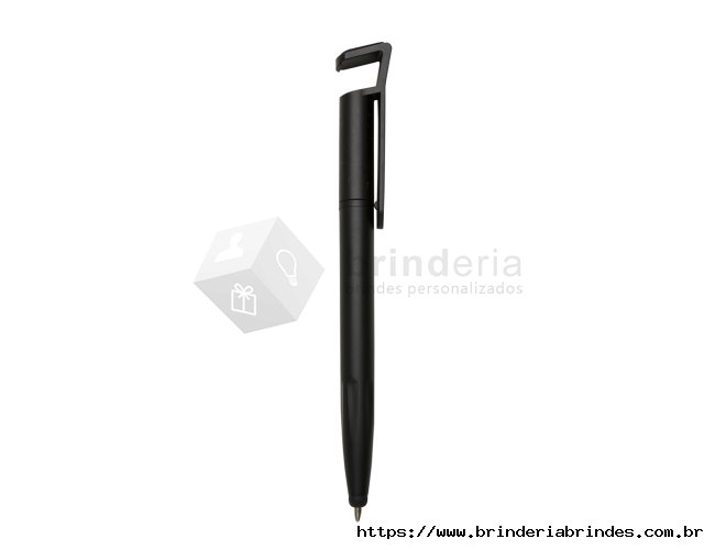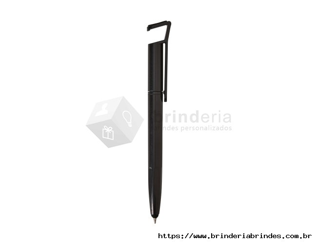Caneta plástica touch com suporte para celular, caneta inteira colorida com detalhes preto. Clip plástico aberto utilizado como suporte para o celular e parte superior com limpador de tela, possui anel preto abaixo do clip e parte inferior com detalhes em relevo. Aciona por giro.