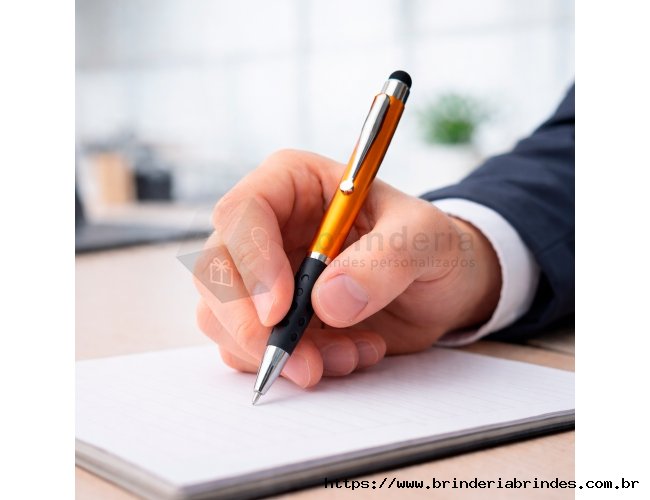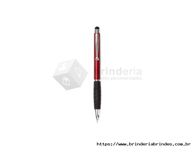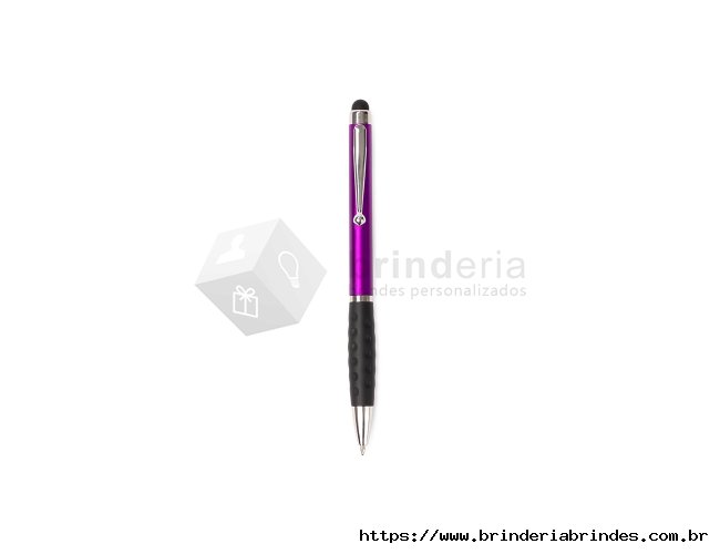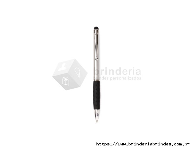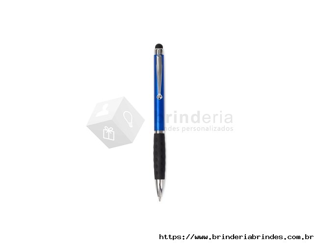 Caneta plástica com ponta, clip e pequenos detalhes em metal, além de detalhes ergonômicos na área próxima à tampa. Possui acionamento por rotação, carga esferográfica azul de 1.0mm e ponteira emborrachada para interação com dispositivos de telas sensíveis ao toque.