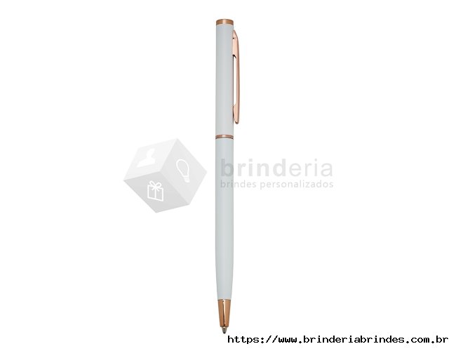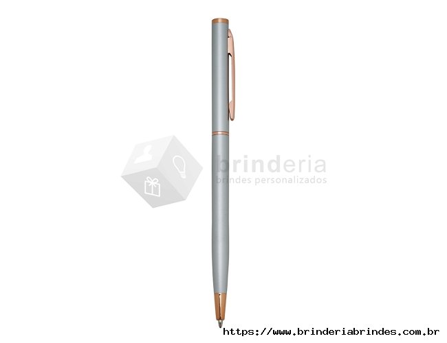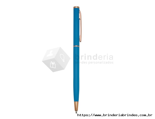 Caneta semimetal com pintura fosca colorida e detalhes em bronze. Clip metálico, acionamento por giro e carga esferográfica azul.