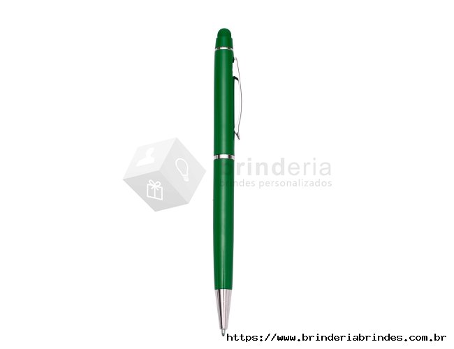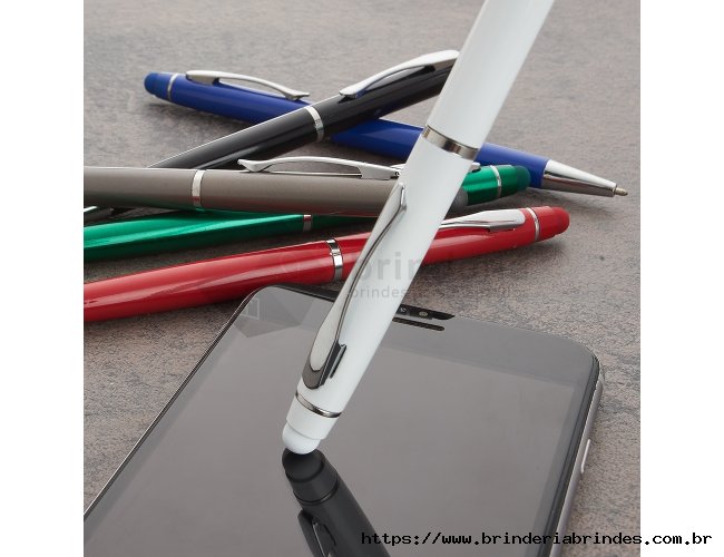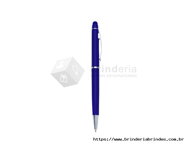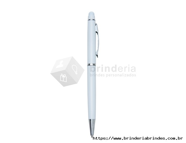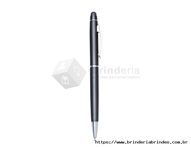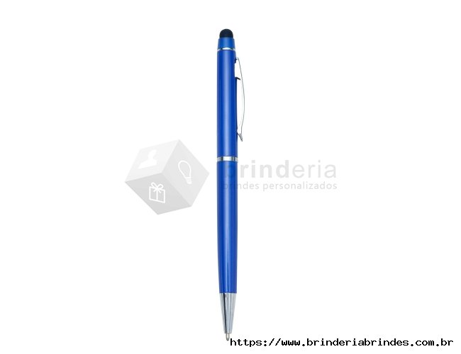 Caneta semimetálica com touch screen, carga esferográfica azul e acionamento por rotação.