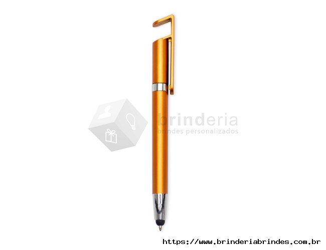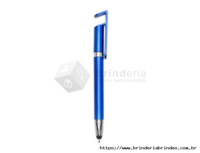 Caneta plástica com suporte para celular e ponteira touch screen. Carga esferográfica azul 1.0mm e acionamento por rotação.