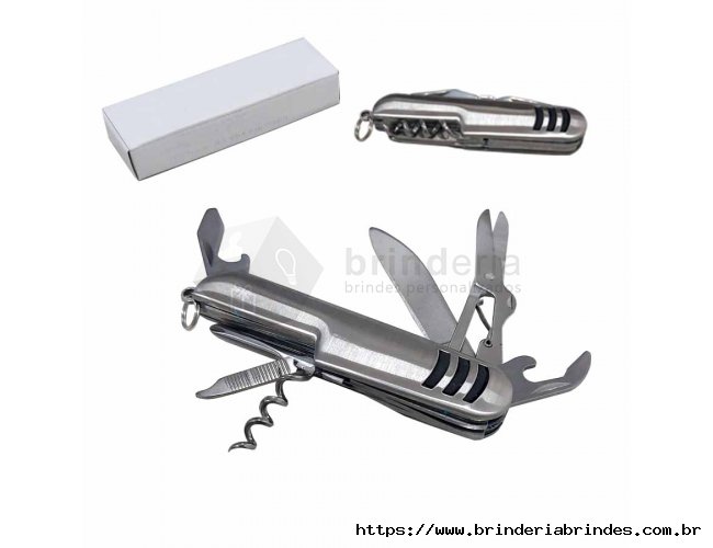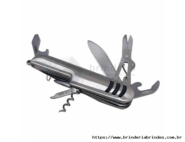 Canivete com 7 funções, material de metal com detalhe emborrachado preto.