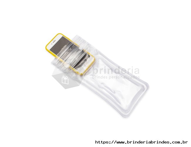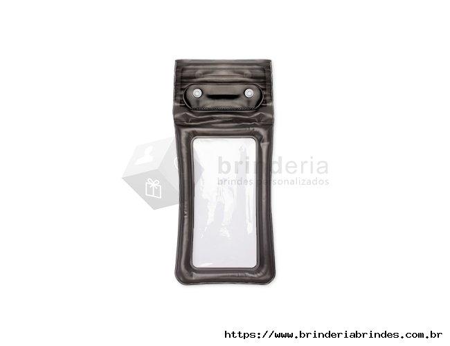 Capa impermeável com classificação IPX8 para smartphones, feita em PVC resistente, com área sensível ao toque que permite o uso pleno do aparelho. Possui vedação hermética e fechamento por botões de plástico. Acompanha cordão ajustável em nylon.